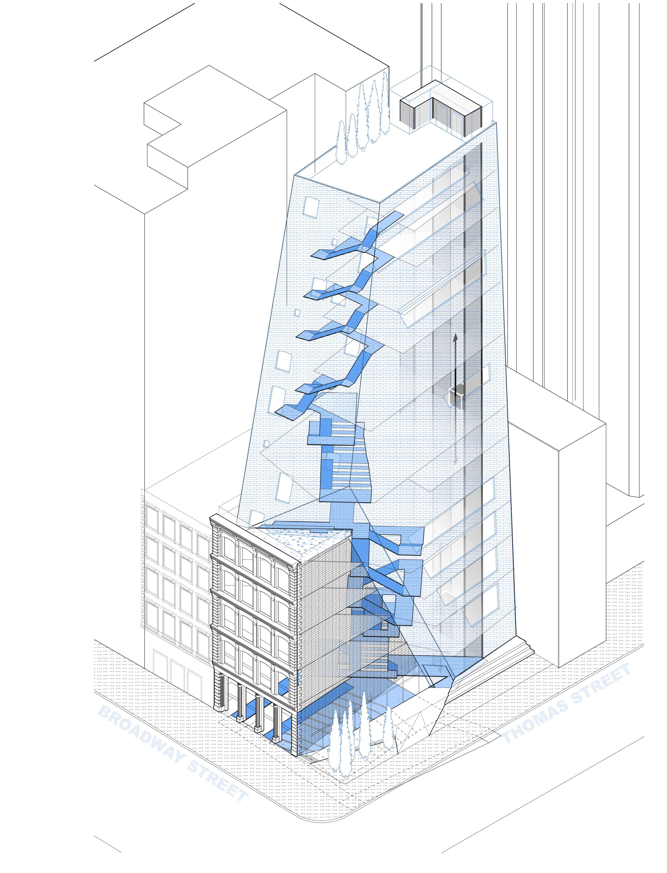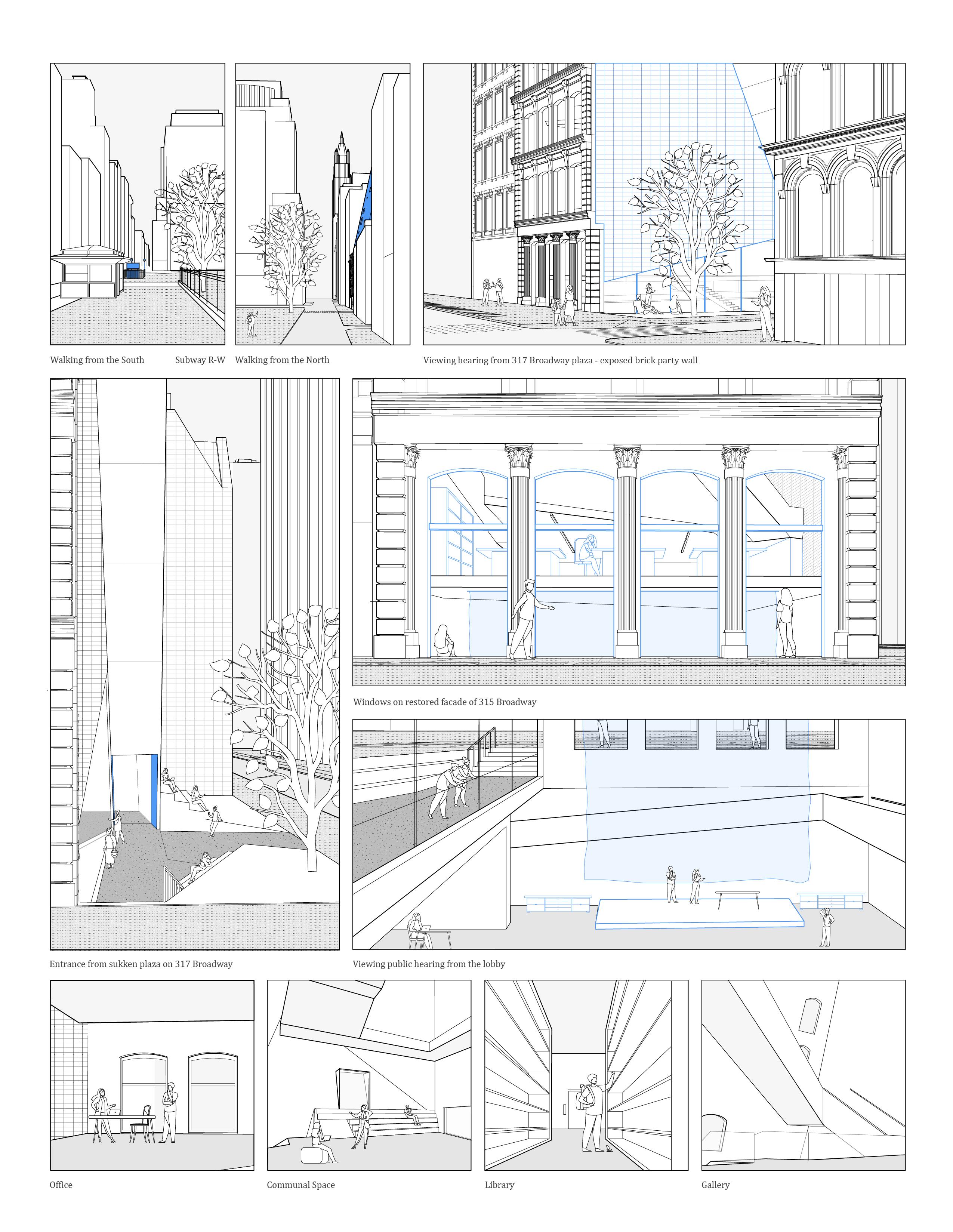 The arch openings visible from the ground floor of Broadway give passersby immediate awareness of the hearings taking place below. As pedestrians turn the corner to the adjacent plaza, they are invited to observe and take part in the hearings. This thoughtful configuration of openings and circulation provides visibility into the typically closeddoor dealings of the Commission, thereby promoting transparency and public participation in matters of historic preservation for the city.