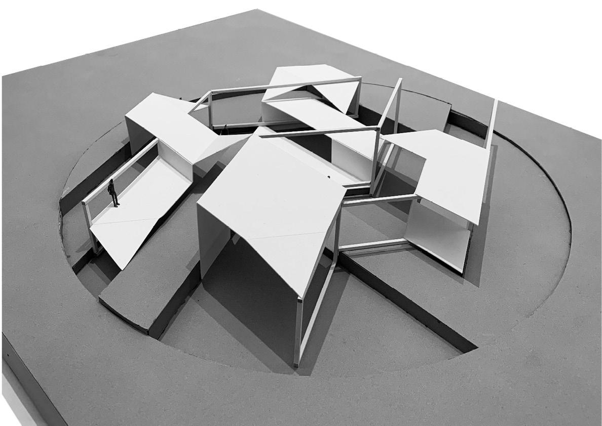 Fold Pavilion is a public space design in downtown Syracuse inspired by the architectural theory of Raumplan in Adolf Loos’ Villa Müller. As an analytical study of this seminal work of early modernism, Fold Pavilion extrapolates Loos’ Raumplan theory of interior spatial organization into a contemporary civic structure. Appropriating the layered geometries, split levels, and doubleheight voids of the iconic Villa Müller residence, Fold Pavilion translates these devices into an engaging urban intervention.