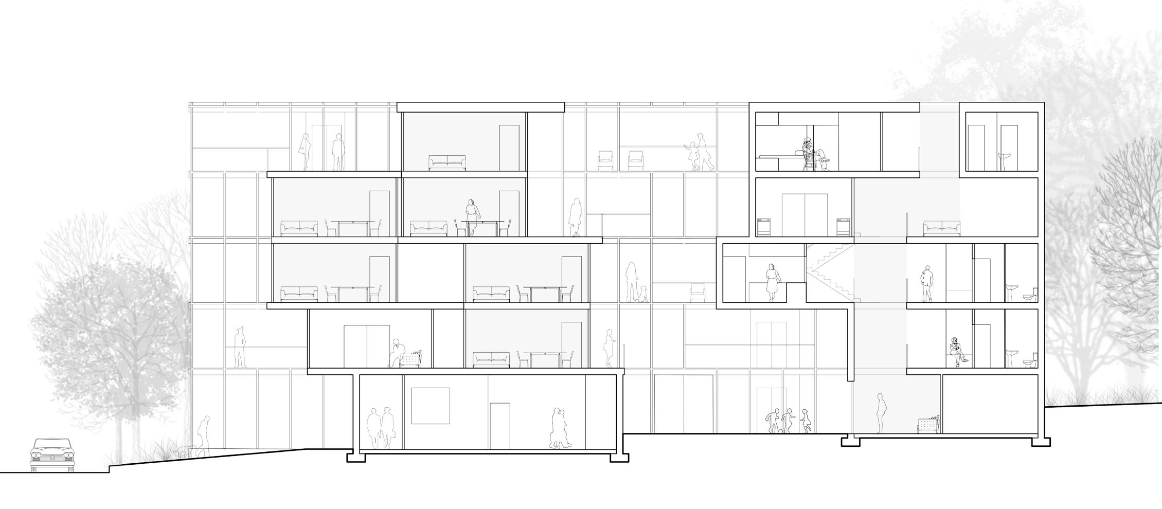 The permanent residents’ housing occupies the prominent facade facing the neighborhood, who will likely have stronger community ties. The transient transitional residents are situated further back where there is more privacy. The central spine fosters connection between all residents on each levels. The clinic situates on the ground level to be a shared resource for the community, while other shared amenities like the laundry are situated in between living units above ground.