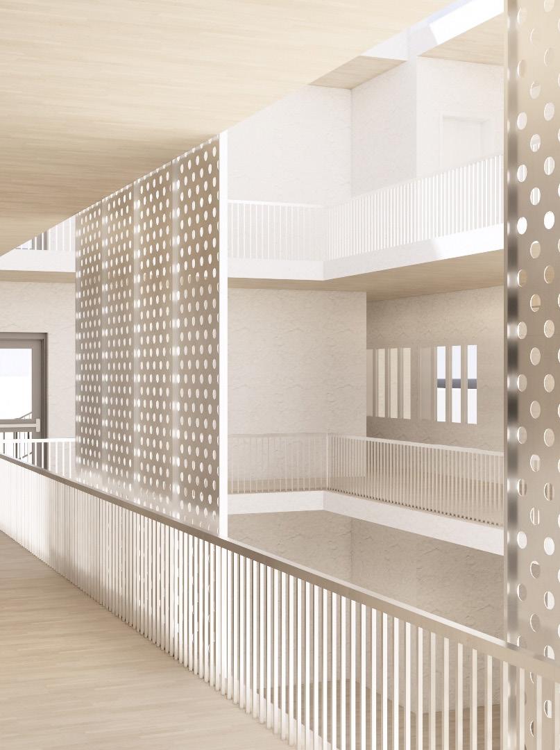 To ensure that natural light from the atrium reaches the second floor, the walls of each residential unit are strategically recessed or extended.