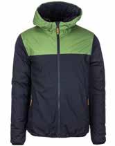 Der Kurzmantel ist reversibel und bietet auf der einen Seite eine wetterfeste Hülle und auf der anderen Seite ein schönes Steppdesign. Zusätzlich ist die wetterfeste Seite mit reflektierenden Applikationen ausgestattet, um die Sichtbarkeit in der Dunkelheit zu erhöhen.