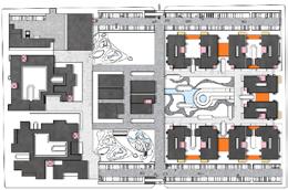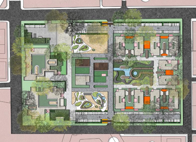 The cluster is further subdivided by the addition of a central circulation zone, resulting in the formation of two green pockets.