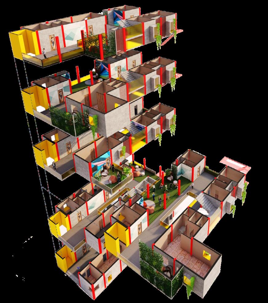 • The voids in the design approach acts as collaborative spaces along the common corridors of hostel blocksas an orchestration of multi-use spaces.