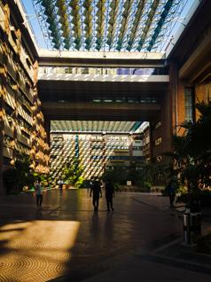 Sky bridges acting as common space and connection between two buildings.