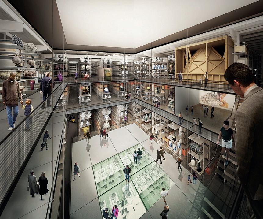 DS&R’s bold competition-winning approach was to revive the concept, much favoured by amateur Victorian collectors, of a great Cabinet of Curiosities (Wunder Kammer): huge awe-aspiring themed displays, spread around three levels of the central atrium, of some of the parent V&A’s prized items. The huge space is reminiscent of that cavernous warehouse in the conclusion of Raiders of the Lost Arc. An unexpected funding ‘windfall’ came from the sale of Blythe House, a redundant west London storage space which formerly held many of the V&A treasurers.