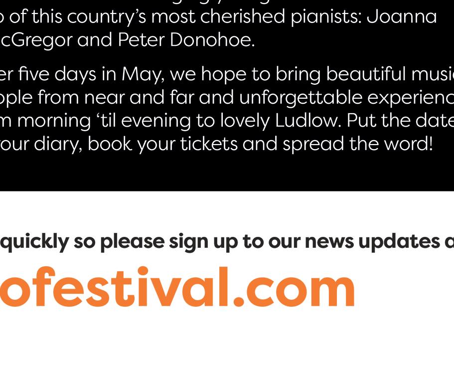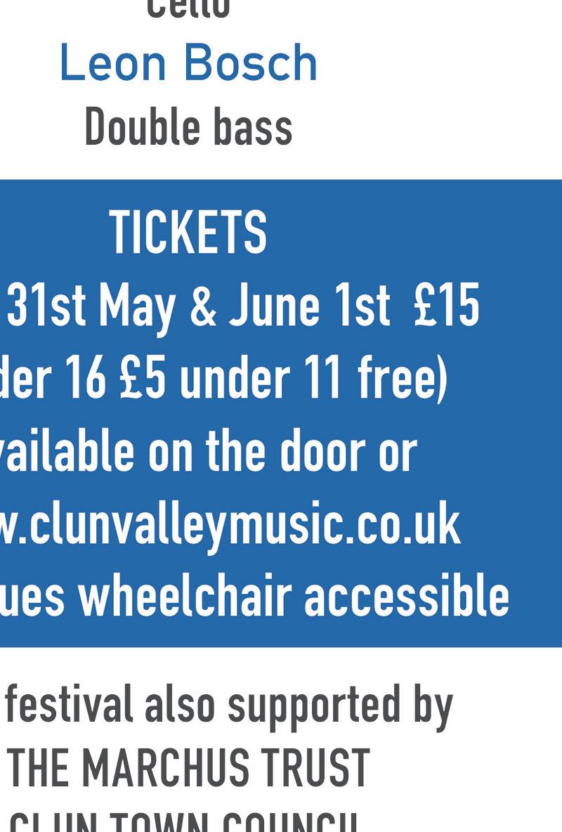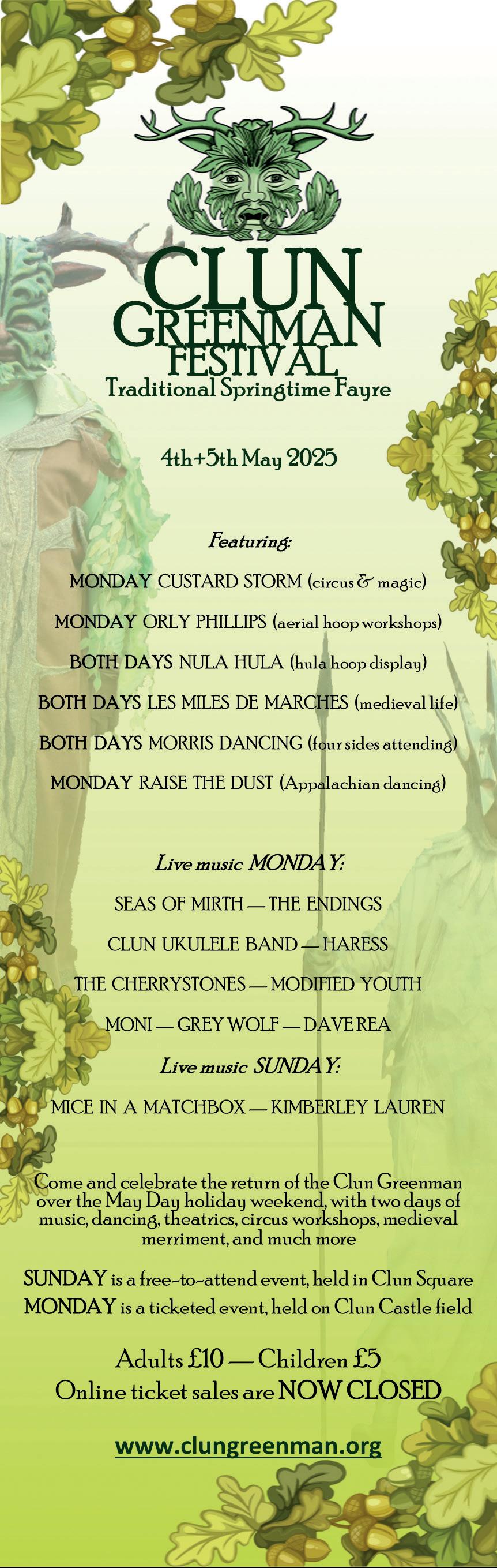 27 May - ‘Riparian Issues on the River Clun Today’, a walk from Aston-on-Clun, led by John Tucker. Meet at Aston-on-Clun VH Car Park, 7.30pm. 7 June - A walk along the River Clun from Leintwardine to Jay Bridge and back. Meet at the Sun Inn, Leintwardine, 11.30am. www.riverclunfestival.co.uk