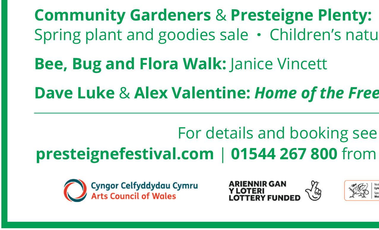 Featuring a weekend of events in Presteigne. 10 May - Plant Plus. Presteigne Community Gardeners and Presteigne Plenty team up for a plant sale, seed swap and spring goodies sale, with nature-themed acivitivies for children. The Yard at Daphne’s Pizza, Presteigne, 10am4pm, free. 11 May - Bee, Bug and Flora Walk. Surveyor of wild bees, wasps, bats and birds, Janice Vincett leads a walk to reveal what is springing into life all around us. Meet at the Community Barn, Went’s Meadow, Presteigne, 1pm-3pm, £10, 01544 267800, www.presteignefestival. com