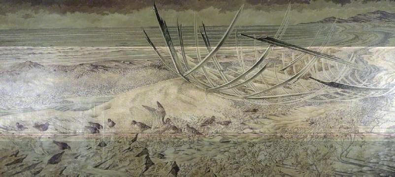 Further out, but still a hundred yards from the sea there was a group of swimmers doing the crawl through the frozen marsh, longer fronds of sedge-grass growing where their hands cut the surface and where their heels kicked up. Their heads were half turned, eyes shut, their mouths half full of water. From another time. Us. Escaping. ….. Not.