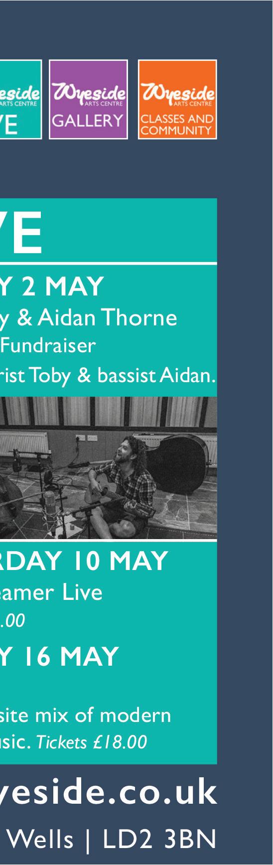Presteigne Youth Centre, Hereford Street. 10am-12pm. Household items repaired for free. Info: 01544 267997. First Saturday of the month LEOMINSTER REPAIR CAFE, 10-12.30pm. Community Centre. Household items, jewellery, clothing etc repaired for free, donations welcomed. Facebook/ website, www.leominsterrepaircafe. org.uk