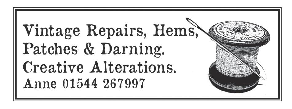 A STITCH IN TIME Careful repairs & creative alterations to well-loved clothes. Vintage a speciality. Anne 01544 267997.