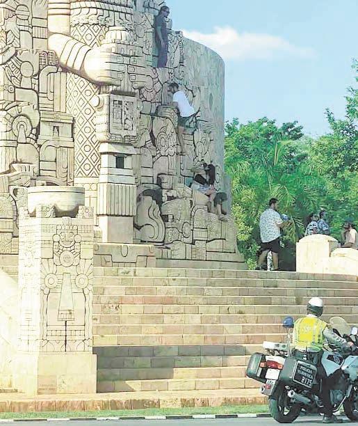De nueva cuenta se registró un abuso por parte de turista en Yucatán, luego de que en redes sociales comenzaron a circular imágenes en donde se observa a un grupo de viajeros escalando el Monumento a la Patria en la ciudad de Mérida en Yucatán. En las imágenes, captadas por el usuario Freddy Iván Cetina, quien no dudo en compartirlas a través de su cuenta de Facebook, se observa a cuatro personas, quienes se desconose si son nacionales o extranjeros, sobre el monumento, recién restaurado por el Instituto Nacional de Antropología e Historia (INAH), mientras que el resto les toma fotos con sus celulares.