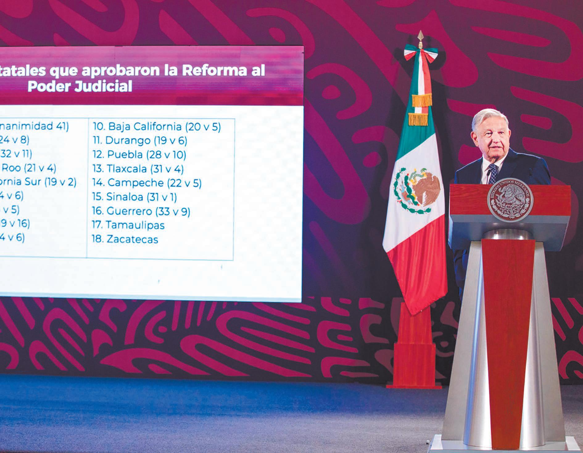 En conferencia de prensa matutina el mandatario explicó que cualquier reforma a la Constitución requiere la aprobación en al menos 17 congresos estatales, de modo que la propuesta del Ejecutivo al Poder Judicial ya es legal al cumplir con todo el procedimiento legislativo.