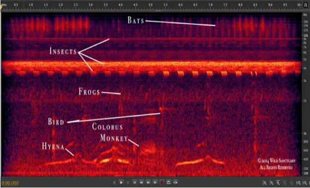After returning home, he printed out the spectrograms of his recordingsspectrograms are visual representations of audio sequences, they look kind of similar to the imagery we associate with ultrasound. The spectrograms “plainly showed distinctive shapes not unlike modern forms of musical notation - the bat was vocalising in the highest frequency range, insects in the middle, the hyrax and hyenas a bit lower, and elephants down at the lowest end of the biophonic score” (Krause, B. 2012, 85). (Spectrogram: Bernie Krause).
