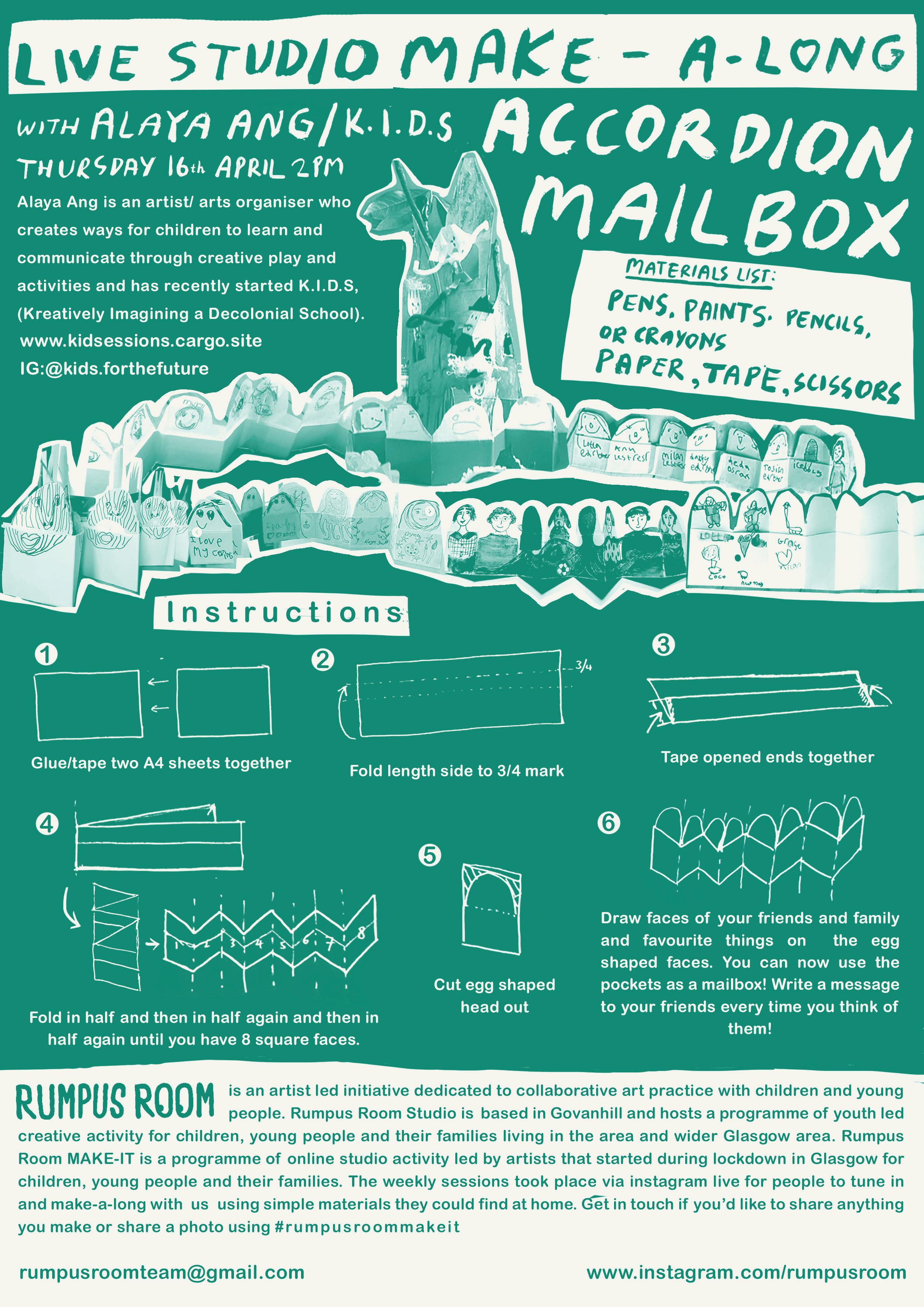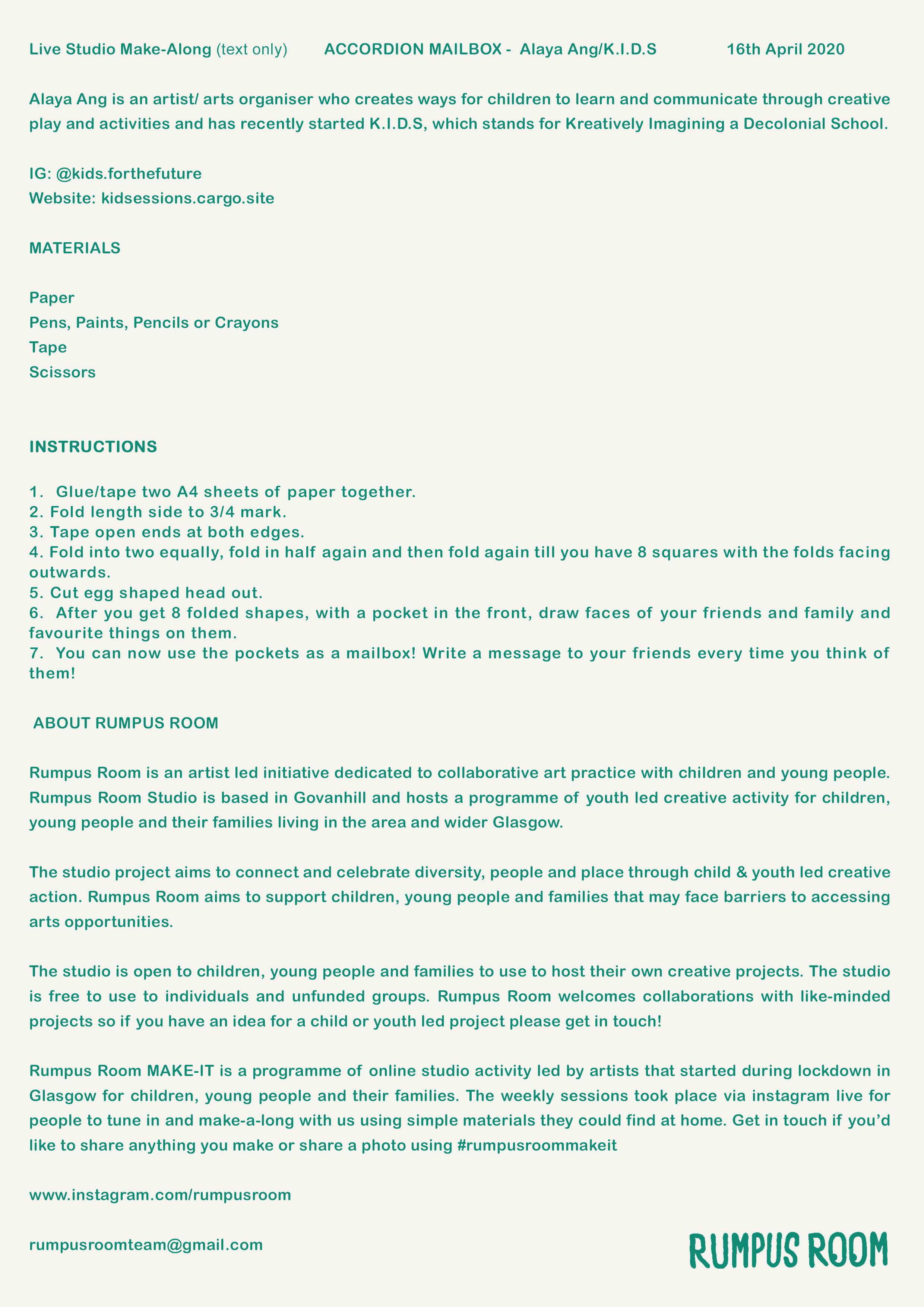 Rumpus Room MAKE-IT is a programme of online studio activity led by artists that started during lockdown in Glasgow for children, young people and their families. The weekly sessions took place via instagram live for people to tune in and make-a-long with us using simple materials they could find at home. Get in touch if you’d like to share anything you make or share a photo using #rumpusroommakeit
