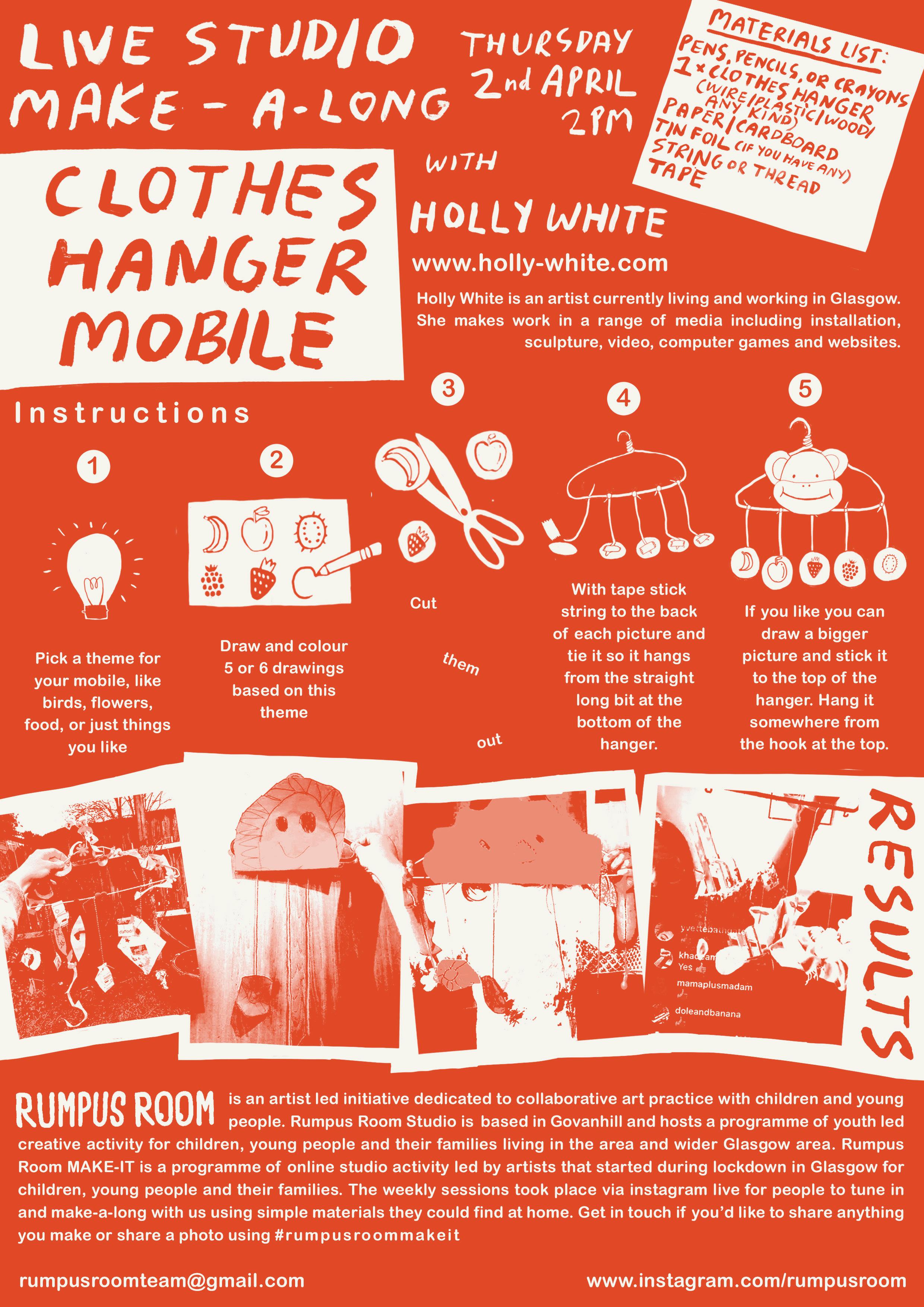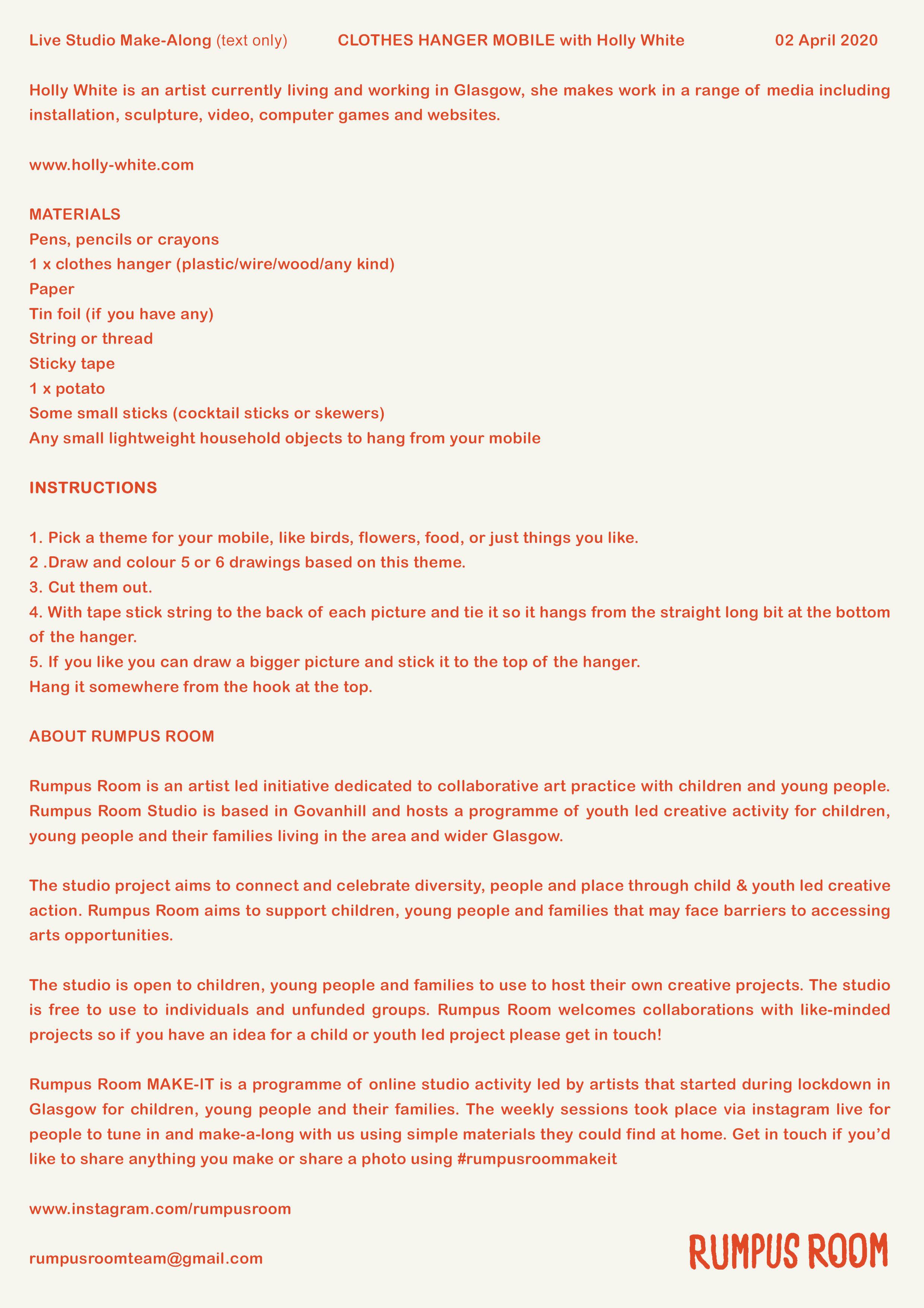 Rumpus Room MAKE-IT is a programme of online studio activity led by artists that started during lockdown in Glasgow for children, young people and their families. The weekly sessions took place via instagram live for people to tune in and make-a-long with us using simple materials they could find at home. Get in touch if you’d like to share anything you make or share a photo using #rumpusroommakeit