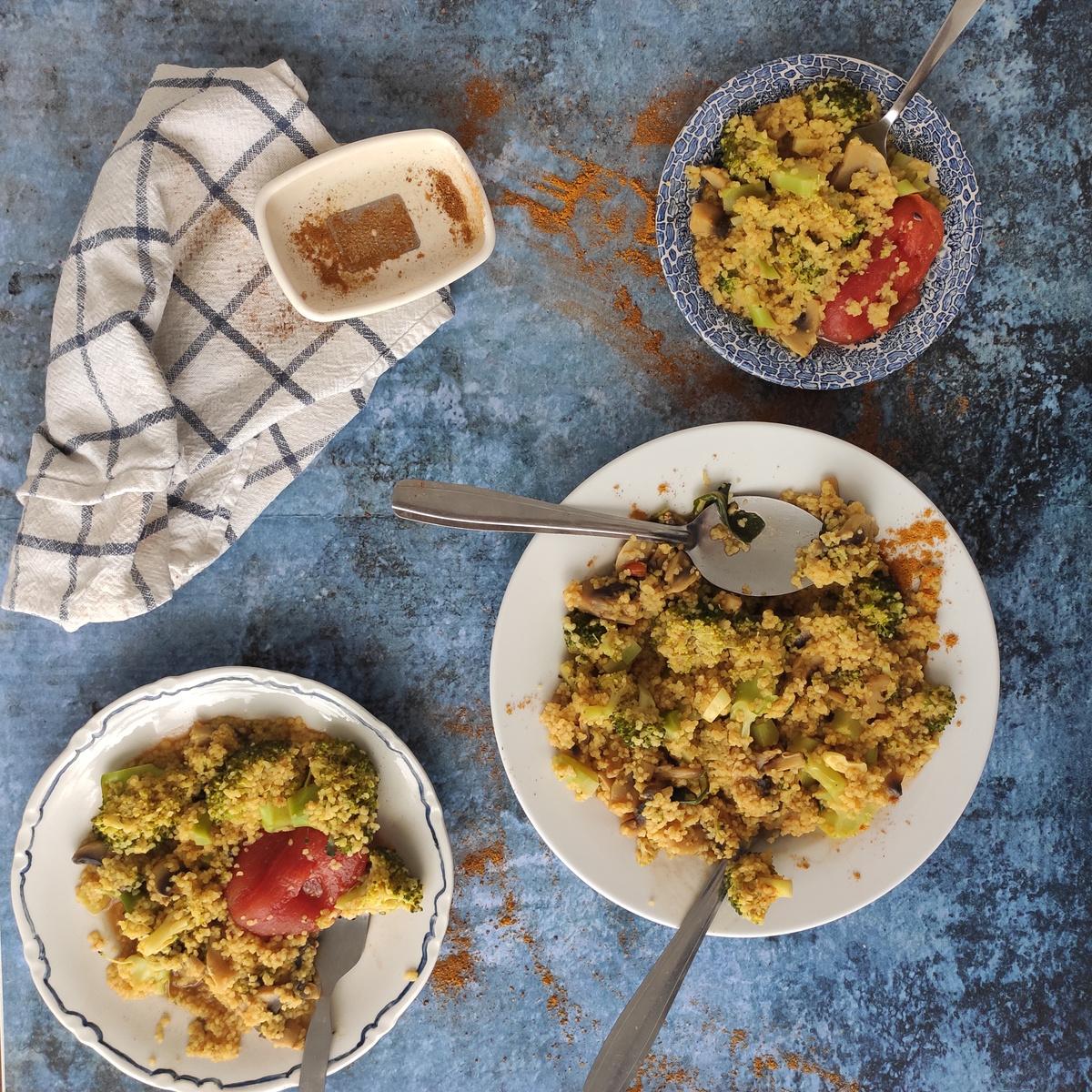 melt the butter and add the chopped shallot add the spices and stir well add the cous cous and sultanas… stir well add the chicken stock and bring to the boil stirring continuously add the fresh coriander cook for 2 3 mins and remove from the heat cover and keep warm for 5 mins serve