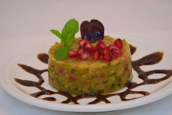 Garnish with crispy baby eggplant, lemon mint leaves and fresh pomegranate, molasses, olive oil