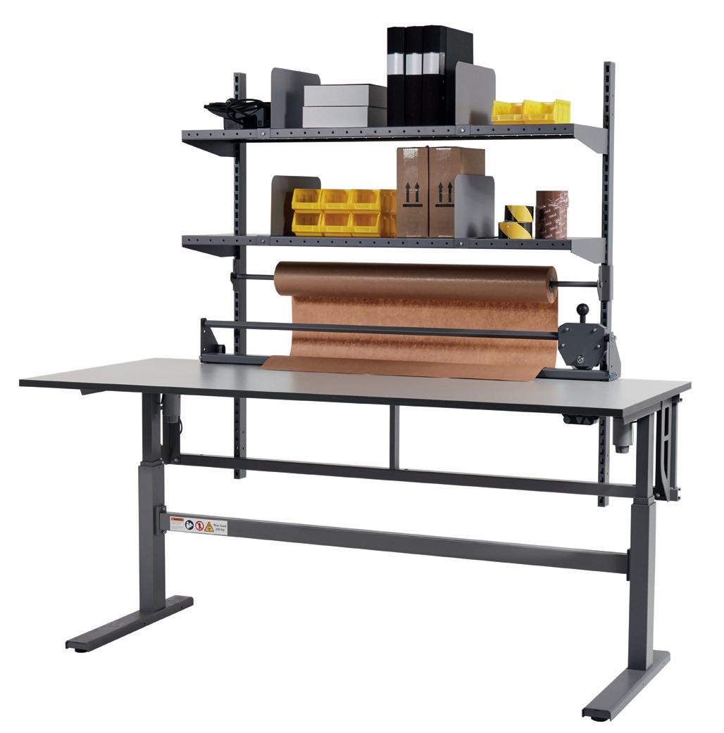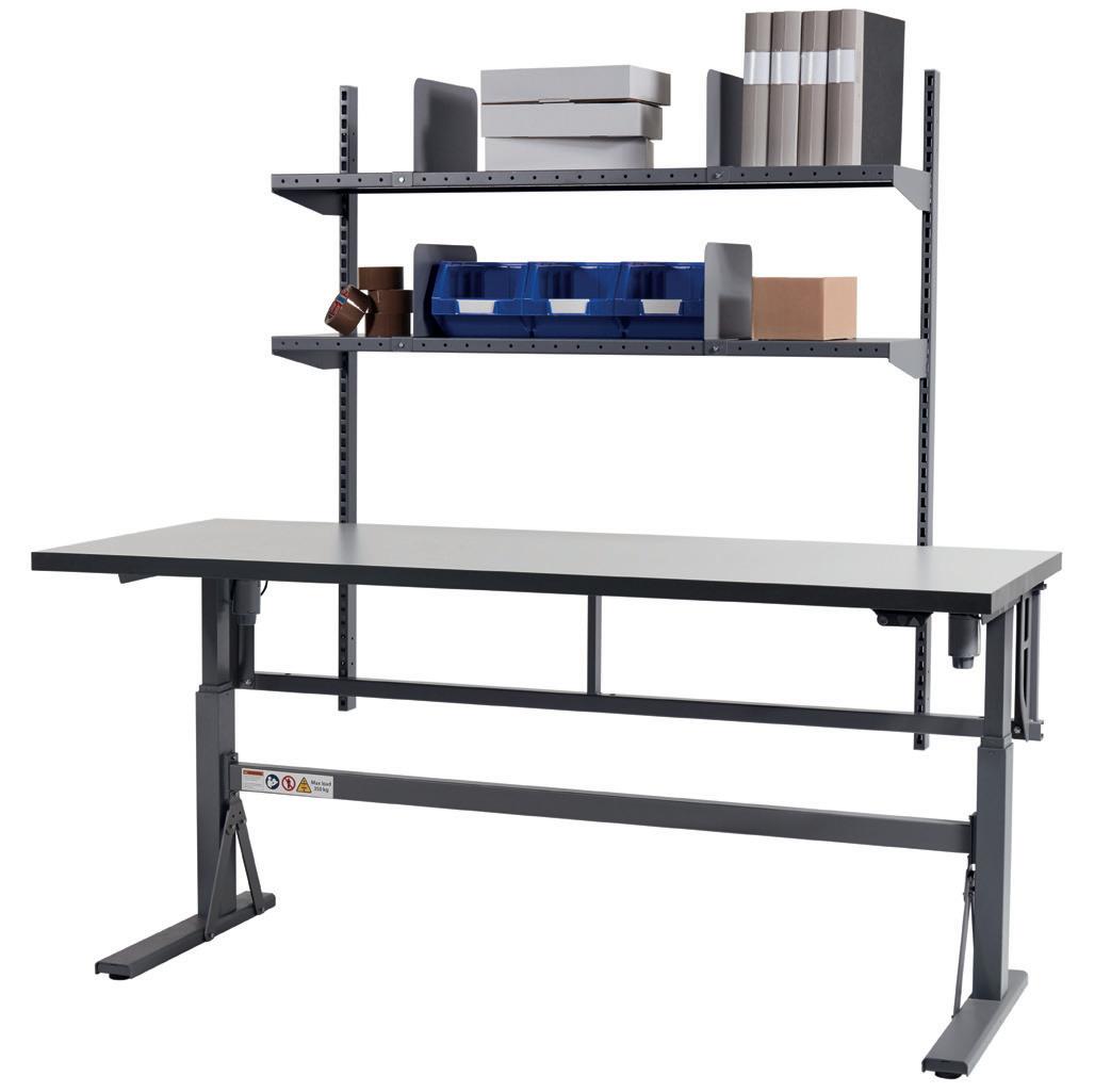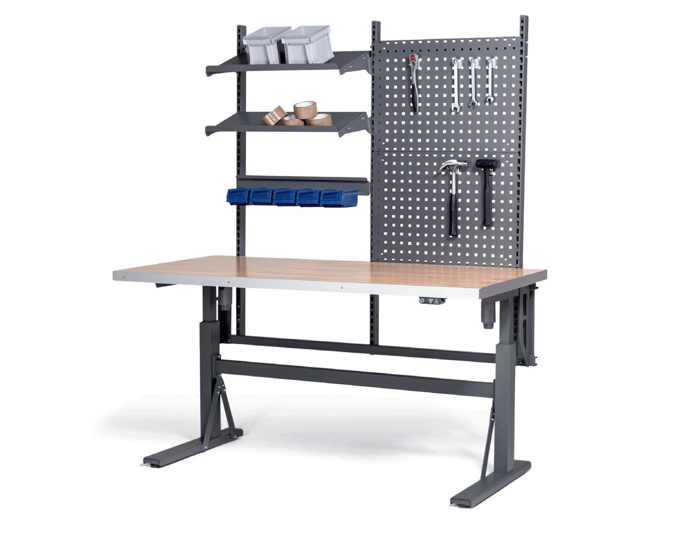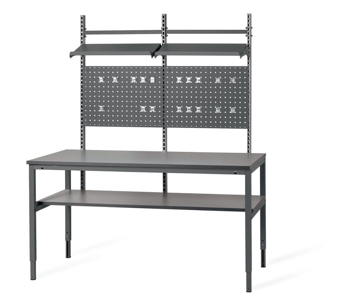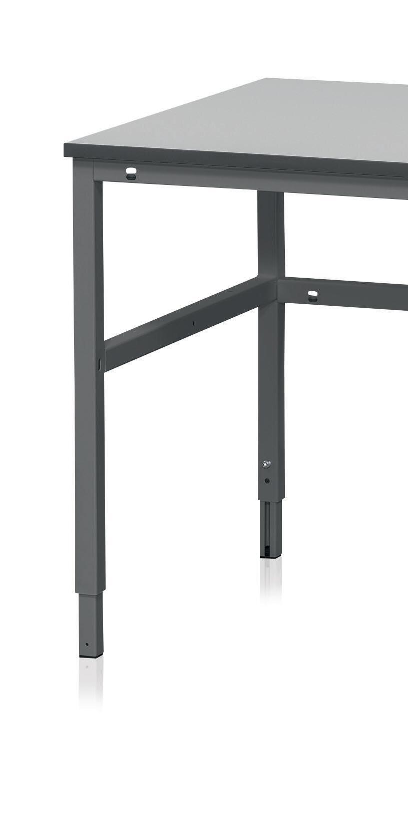 Robusta arbetsbord med justerbar arbetshöjd. Mycket stabil konstruktion med kraftiga profilrör, 40x40 mm, i grå pulverlack. Bordet är komplett med 3 tvärstag som förbinder H-stativen, ökar stabiliteten ännu mer. Bordsskivorna är 24 mm tjocka, i ljusgrå högtryckslaminat. Grafitgrå kantlister till alla bordsskivor. Underhylla för 800 mm djupa arbetsbord. Ljusgrå högtryckslaminat 24 mm tjock.