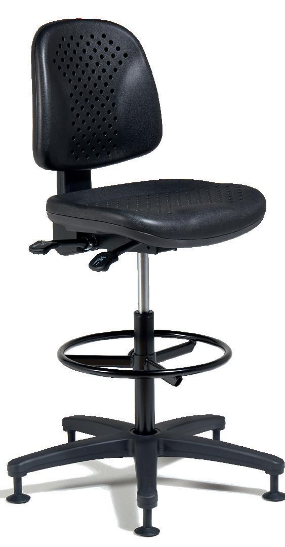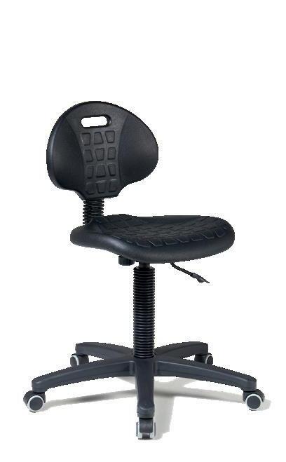 Åkstol med PU-gjuten sits. En stabil stol med enkel och funktionell mekanism. Levereras med hjul för hårda golv. Sitthöjd 410-550 mm. Sitsbredd 340 mm.