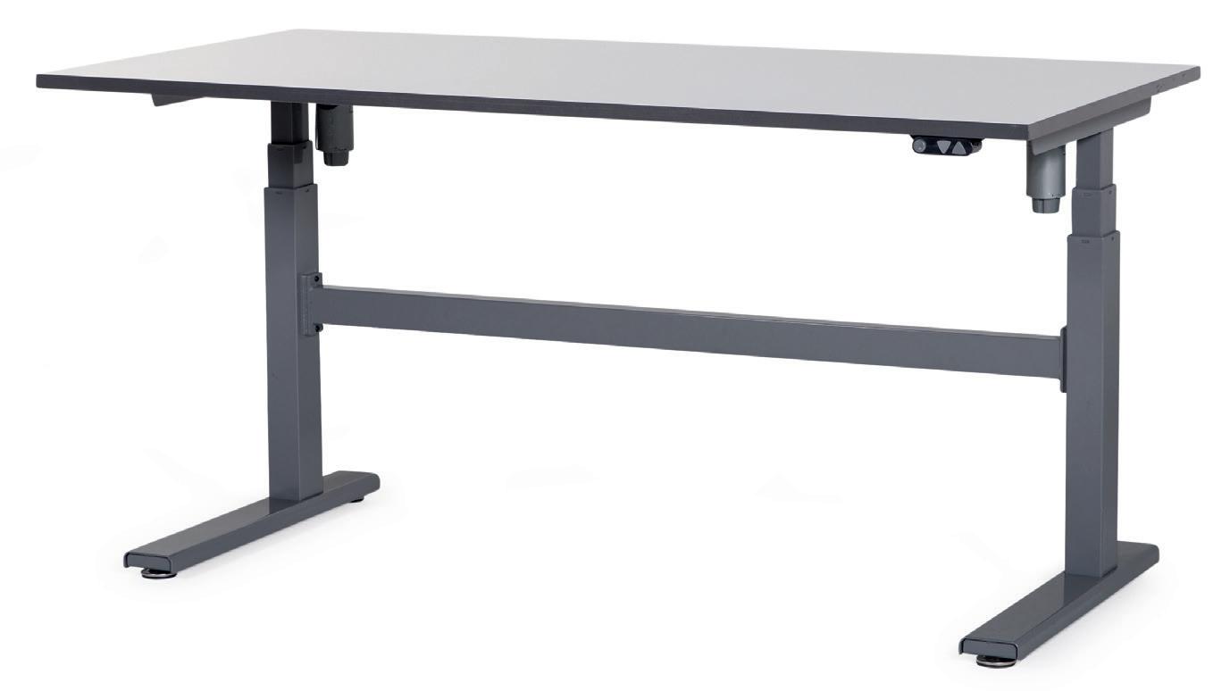 Kraftigt och stabilt elbord med säker tvåknappsfunktion för höj- och sänkning av arbetsbordet. Utrustat med en rejäl 24 mm bordsskiva i grå HPL-laminat, stomme av träspån. Mycket tålig yta som är lämplig för montage. Ett arbetsbord av högsta kvalitet som klarar daglig användning i verkstad och industri.