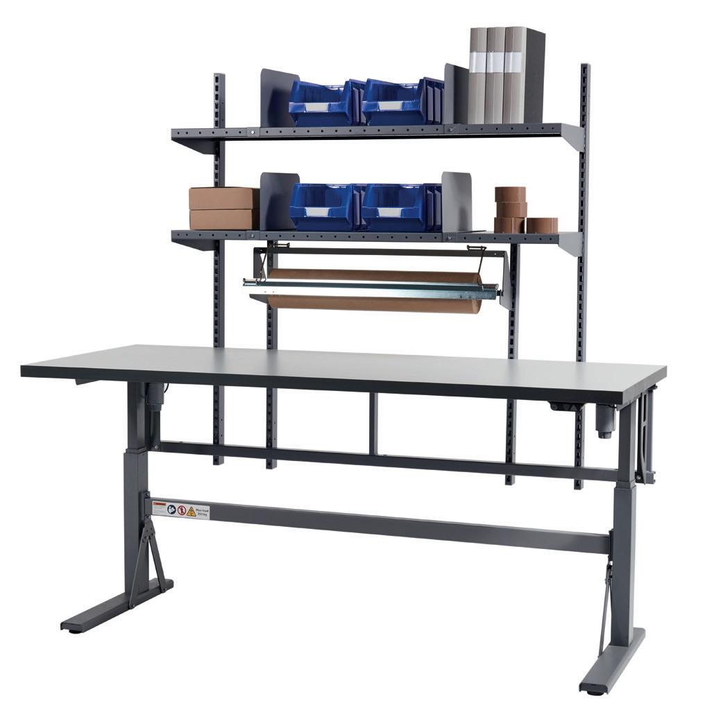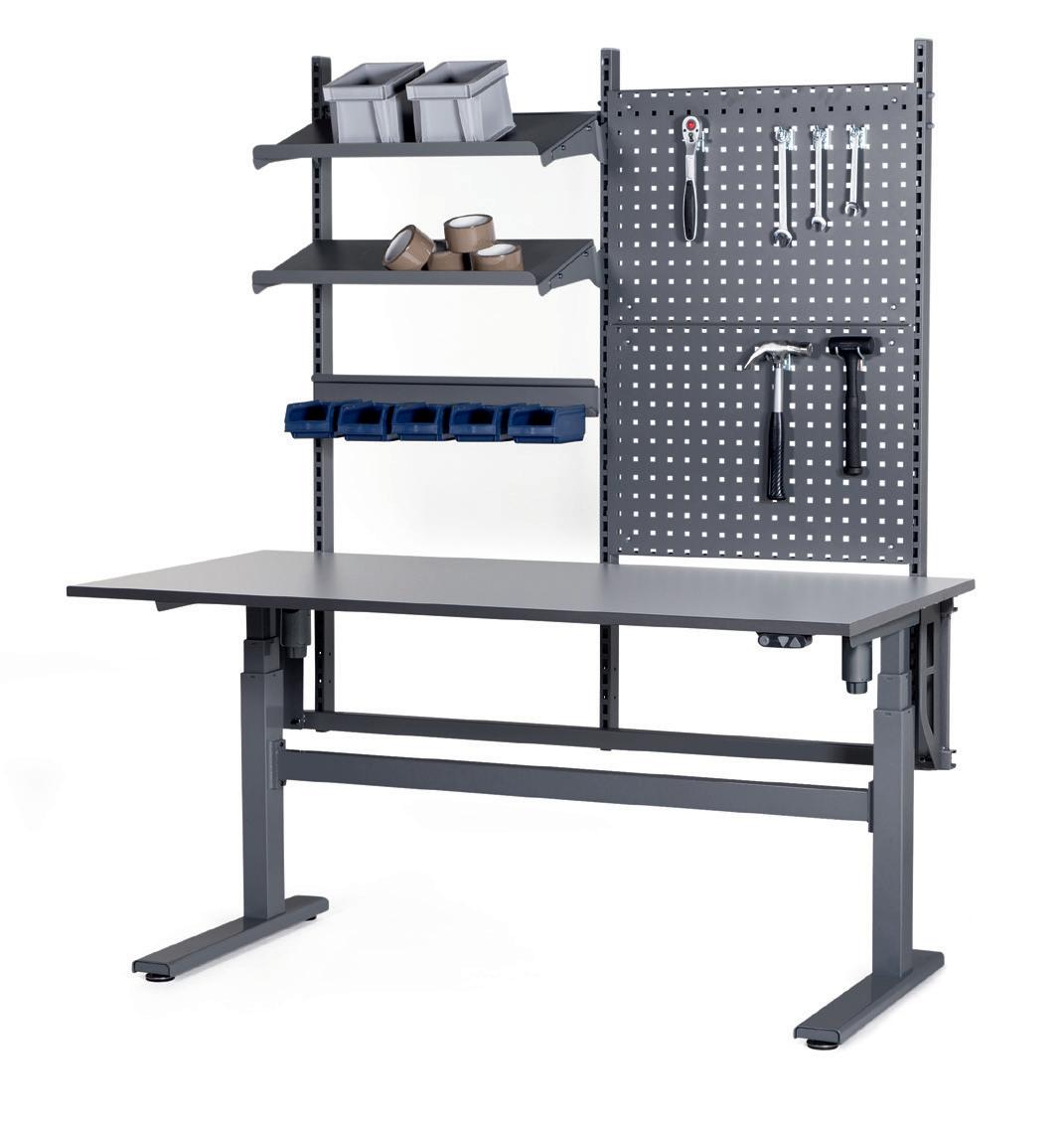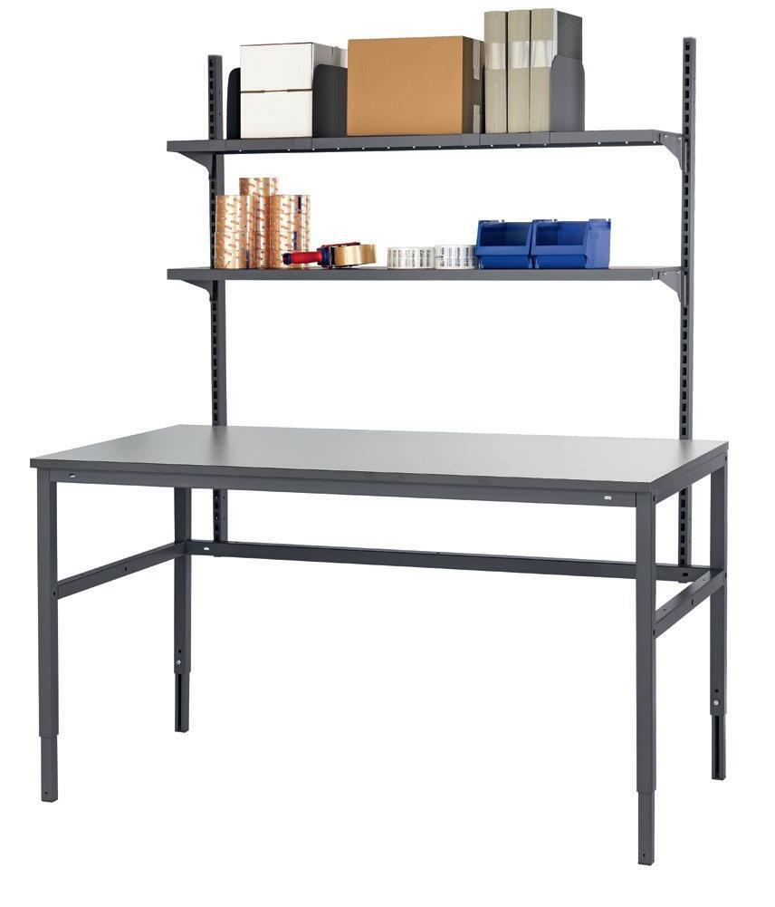 Robusta arbetsbord med justerbar arbetshöjd. Mycket stabil konstruktion med kraftiga profilrör, 40x40 mm, i grå pulverlack. Bordet är komplett med 3 tvärstag som förbinder H-stativen, ökar stabiliteten ännu mer. Bordsskivorna är 24 mm tjocka, i ljusgrå högtryckslaminat. Grafitgrå kantlister till alla bordsskivor. Underhylla för 800 mm djupa arbetsbord. Ljusgrå högtryckslaminat 24 mm tjock.