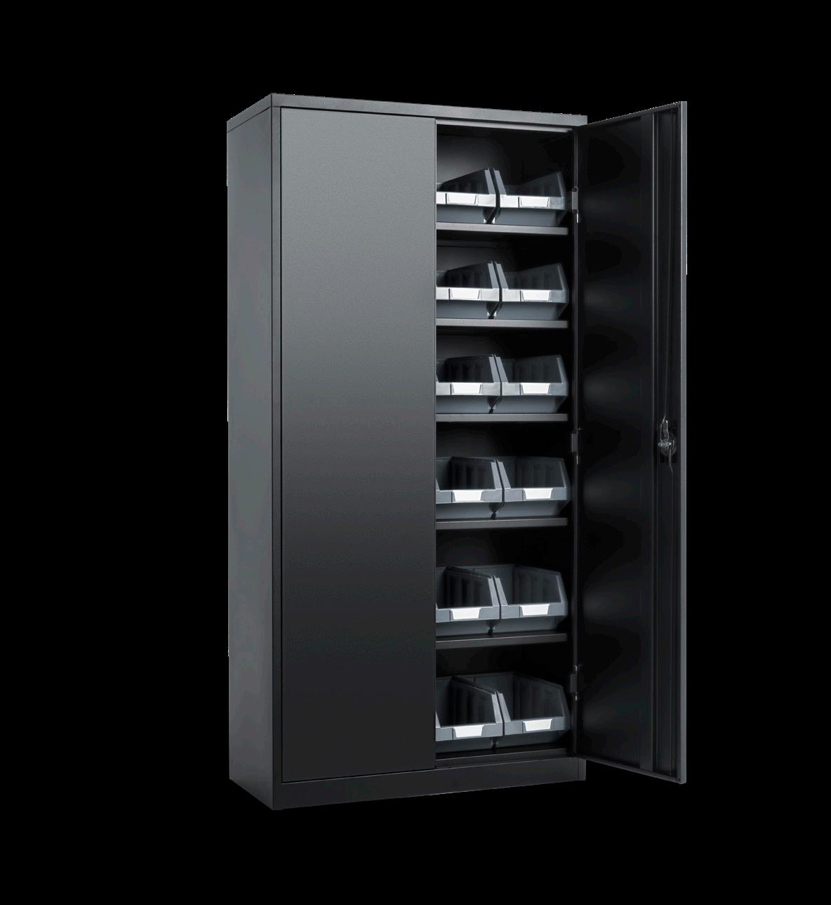 Ett lättmonterat förvaringsskåp för kontor, arkiv, lager eller verkstad. Levereras komplett med 5 hyllplan, 24 st Modulback Durum BxDxH 345X205x164mm, etiketter och spanjolettlåsning med 2 nycklar. Hyllplanen är flyttbara med 32 mm intervall. Skåpet är pulverlackerat med struktur för en hög kvalité och finish, mycket stryktåligt och motståndskraftigt mot repor. Finns i ljusgrått och svart med backar i grått, blått eller rött.