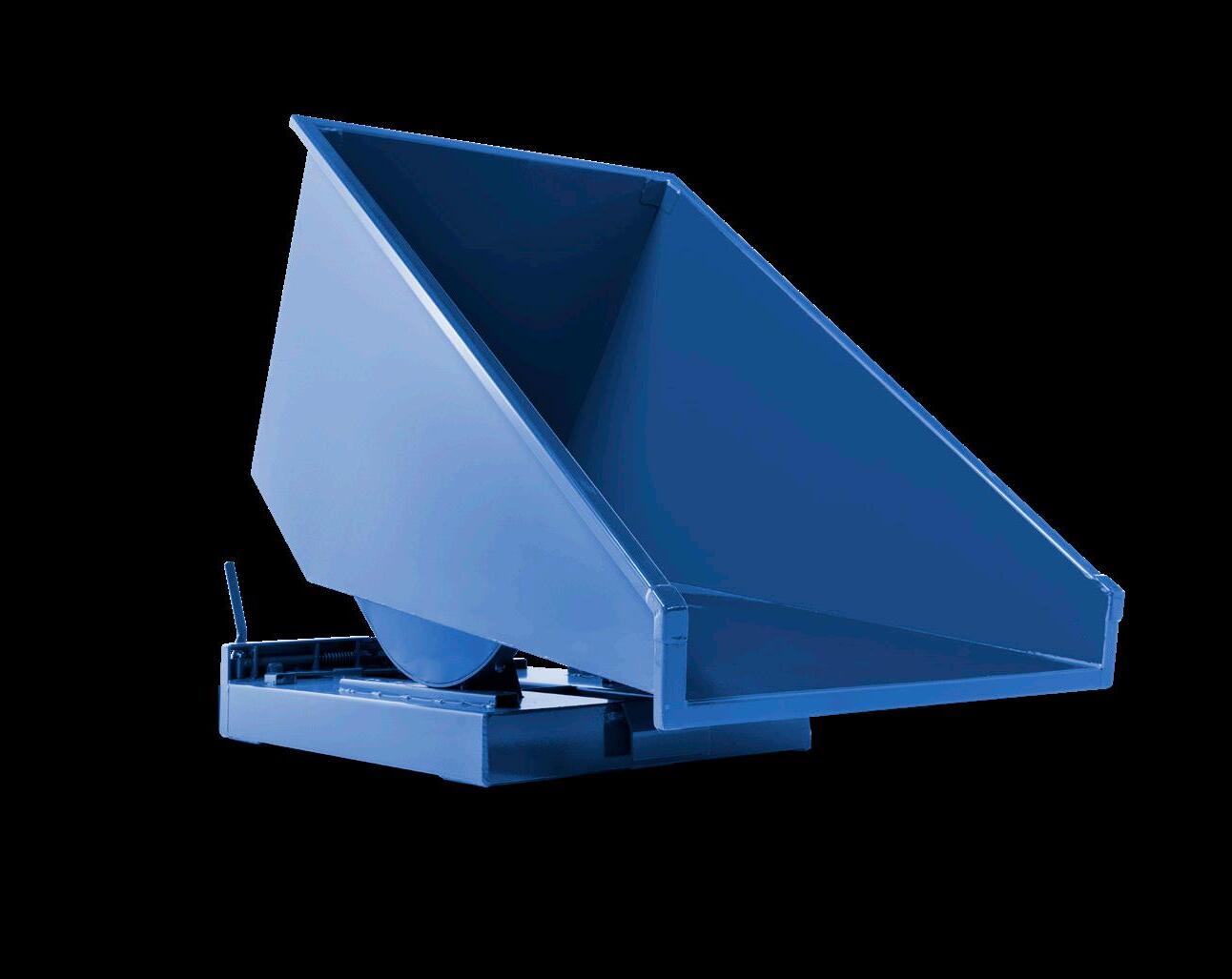 Extra kraftfull tippcontainer med förstärkt underrede för alla typer av gods. Lättmanövrerad och smidig container med styrning av godset vid tippning, detta genom den brutna fronten som skapar stöd för godset. Hörnen på fronten är förstärkta med vinkelprofiler. Kan tömmas på 3 sätt: Gaffelspridning, fjäderbelastad platta i fronten och manuellt med handtag. Standardfärg blå RAL5019.