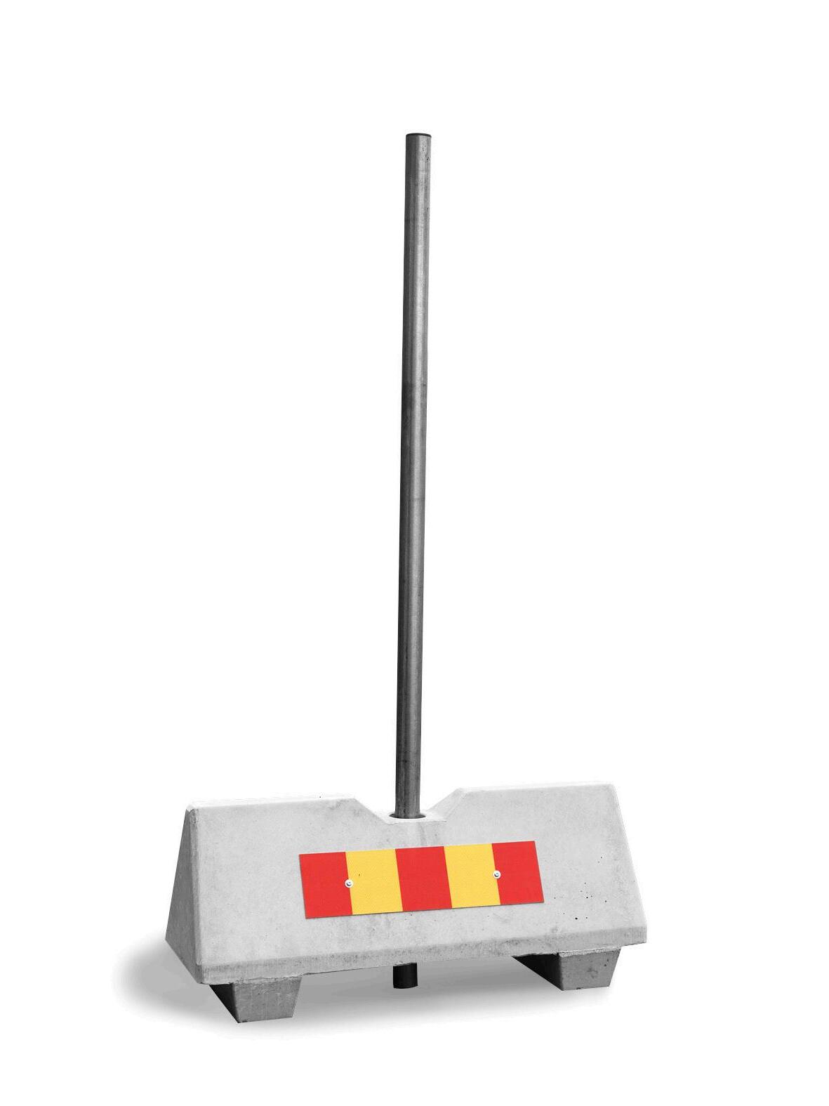 För påkörningsskydd och avspärrning i gjuten betong. Finns med eller utan 70 mm hål för stolpe. Utförande i obehandlad grå betong eller vitmålad. Med eller utan reflexplatta på båda sidor. Höjd 465, längd 1090, bredd 390 mm. Vikt 250 kg.
