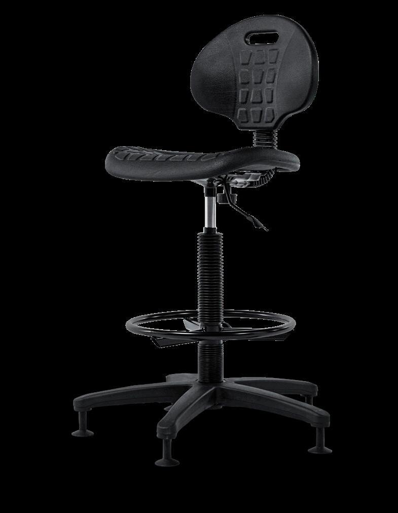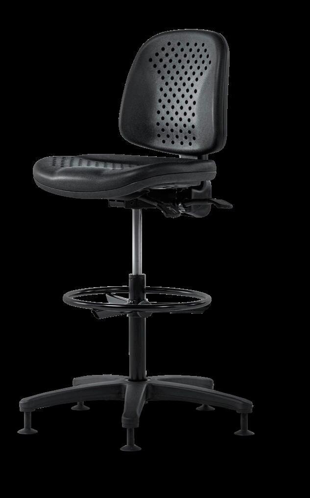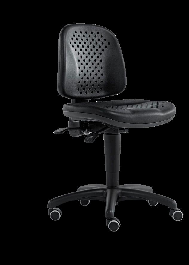 En ergonomisk och stabil industristol med ventilerad PU-gjuten sits och rygg. Den låga modellen levereras med hjul för hårda golv och den höga med glidfot och fotring. Sitsbredd 490 mm. Sitsdjup 450 mm. Rek. användning 8 h/dygn. Låg modell har sitthöjd 430-560 mm. Hög modell har sitthöjd 590-860 mm.