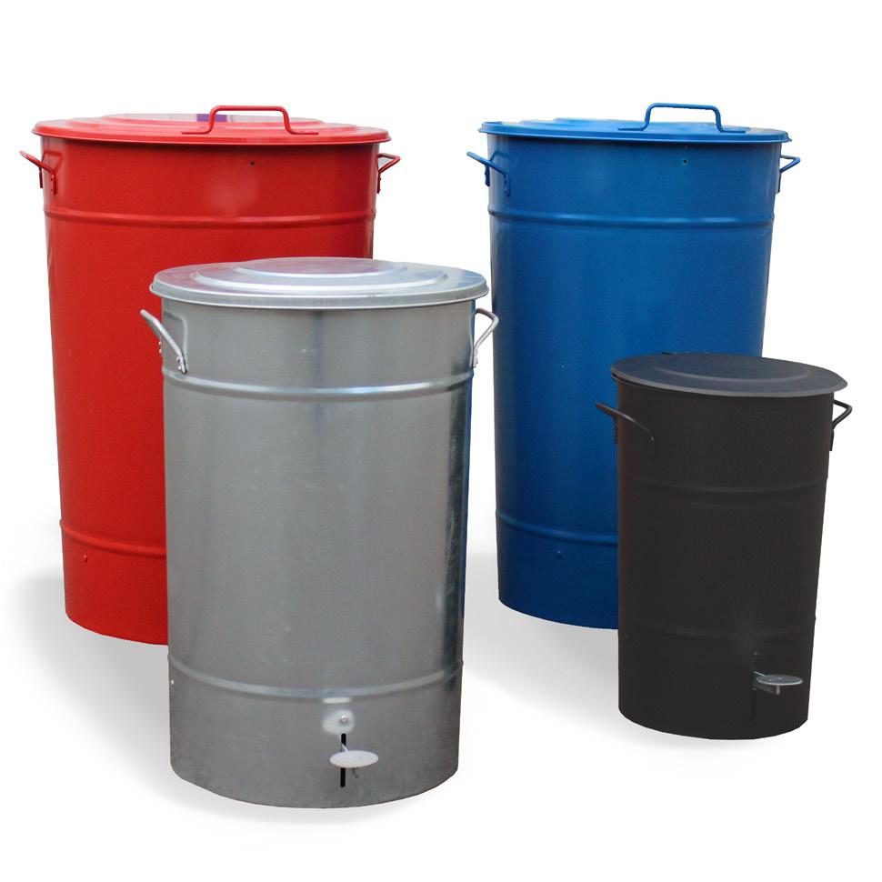 Avfallsbehållare i galvaniserad plåt som passar bra till förvaringskärl eller soptunna. Komplett med lock, fast monterat med gångjärn. Praktiska bärhandtag gör det enkelt att flytta tunnan vid behov. Storlek 30 och 70 liter är utrustade med fotpedal. Finns i fyra färger: Galvad, svart, röd och blå.