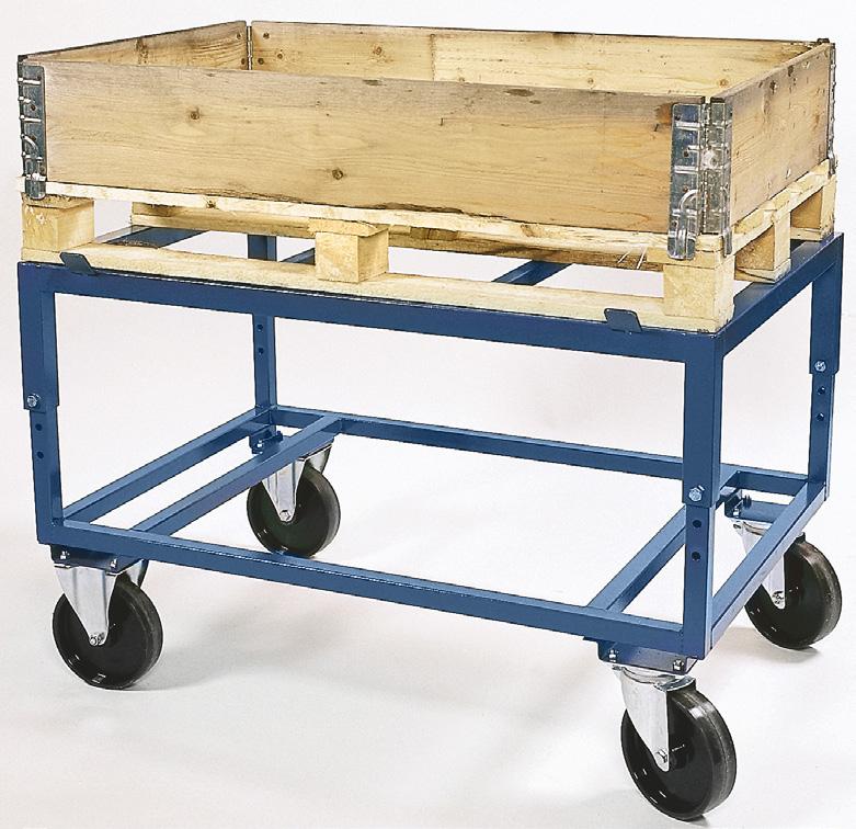 Svensktillverkade pallvagnar i toppkvalité för hel- eller halvpall. Utrustade med stödklackar på två sidor, som håller pallen på plats. Rullagrade hjul Ø 200 mm. Två fasta, två länkhjul.