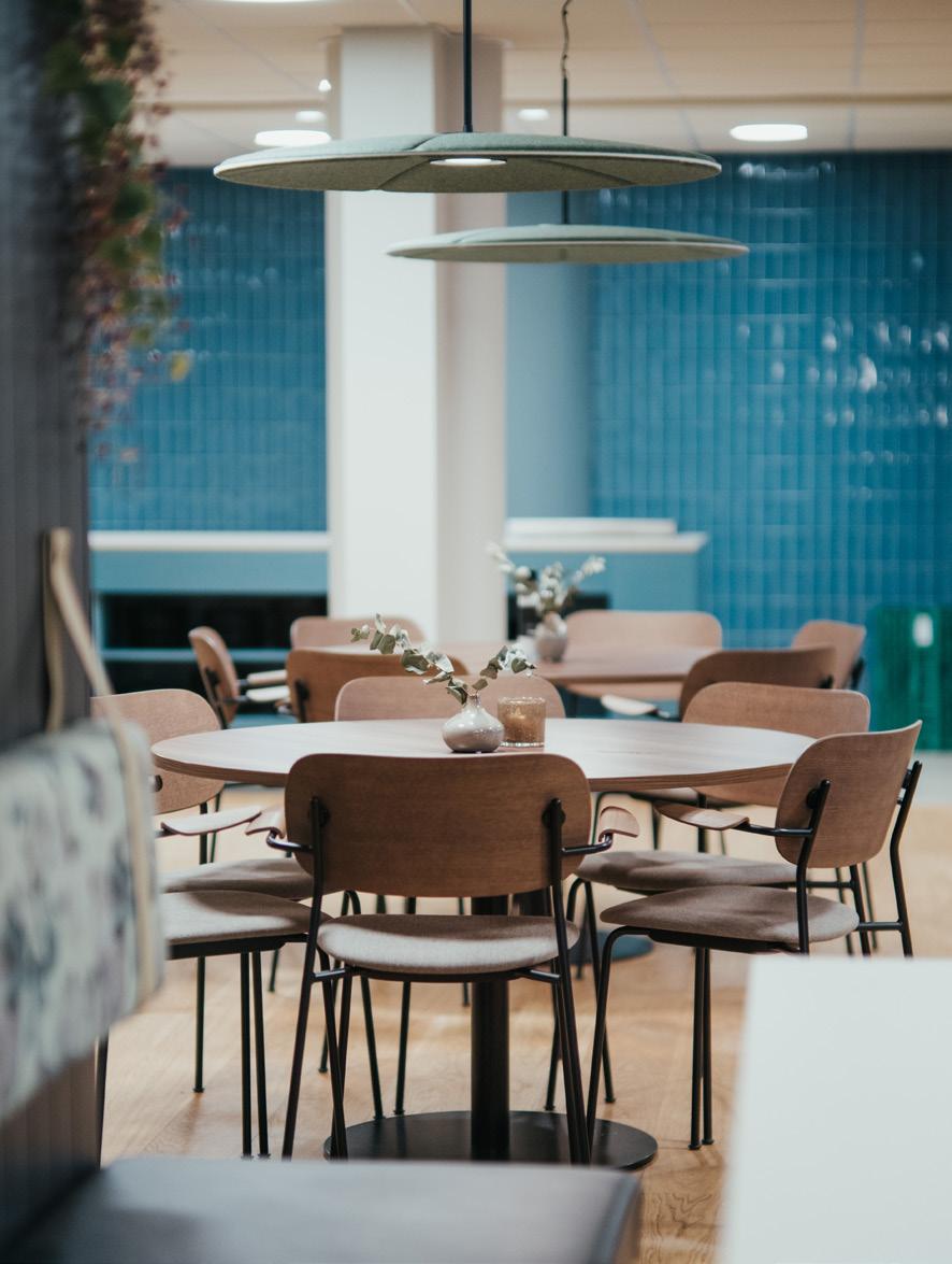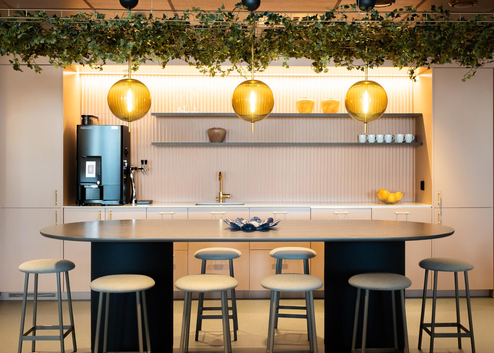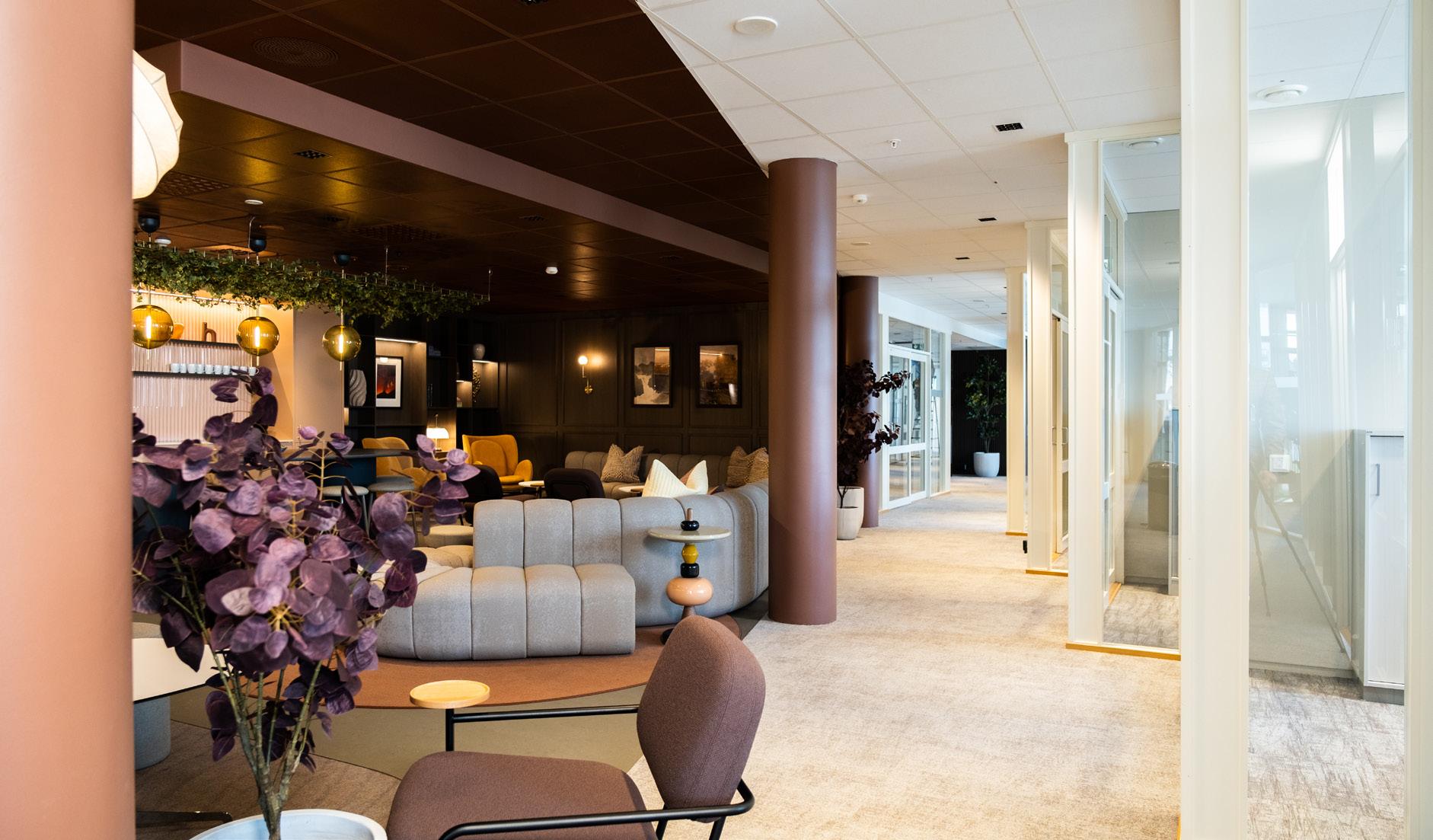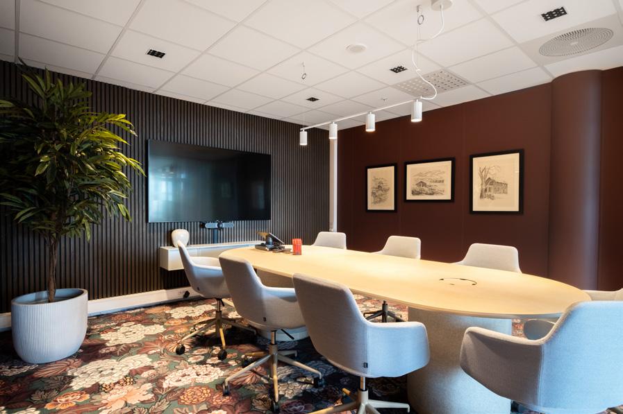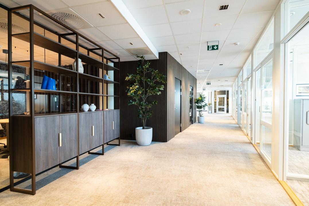 Vi kunne ikke vært mer fornøyd med resultatet! Med bruk av en varm fargepalett kombinert med spreke fargevalg og mønster, har vi fått helt unike lokaler som gir oss energi i en hektisk hverdag. Sosialsona som ligger i hjerte av bygget, har blitt en fantastisk møteplass for alle ansatte. Her kan vi finne hvilepulsen med en kaffekopp i en behagelig og lun atmosfære, samtidig som vi kan diskutere faglige problemstillinger på tvers. Møterommene har med sine mønster og farger blitt en arena hvor kreativiteten får blomstre i takt med teppegulvene.