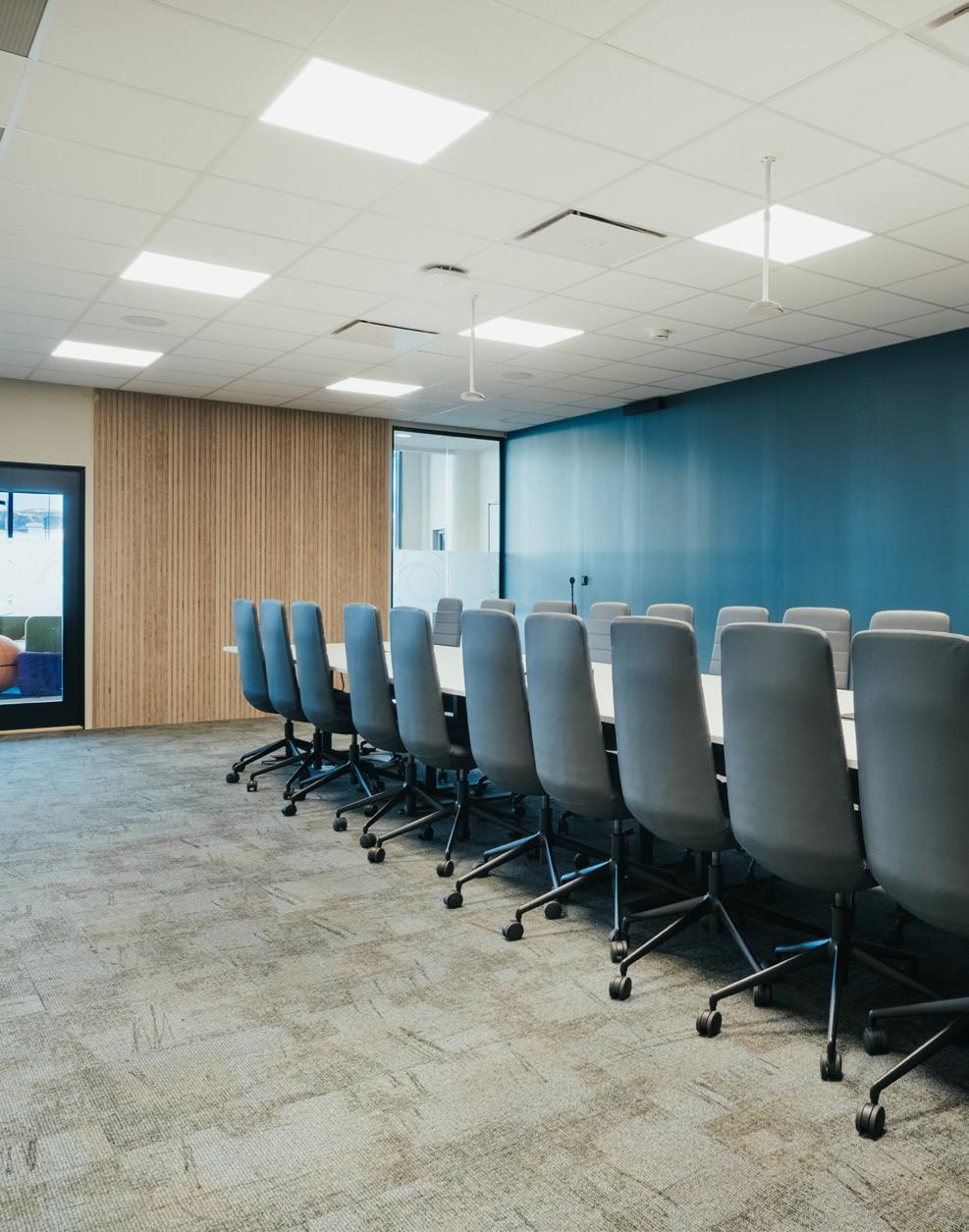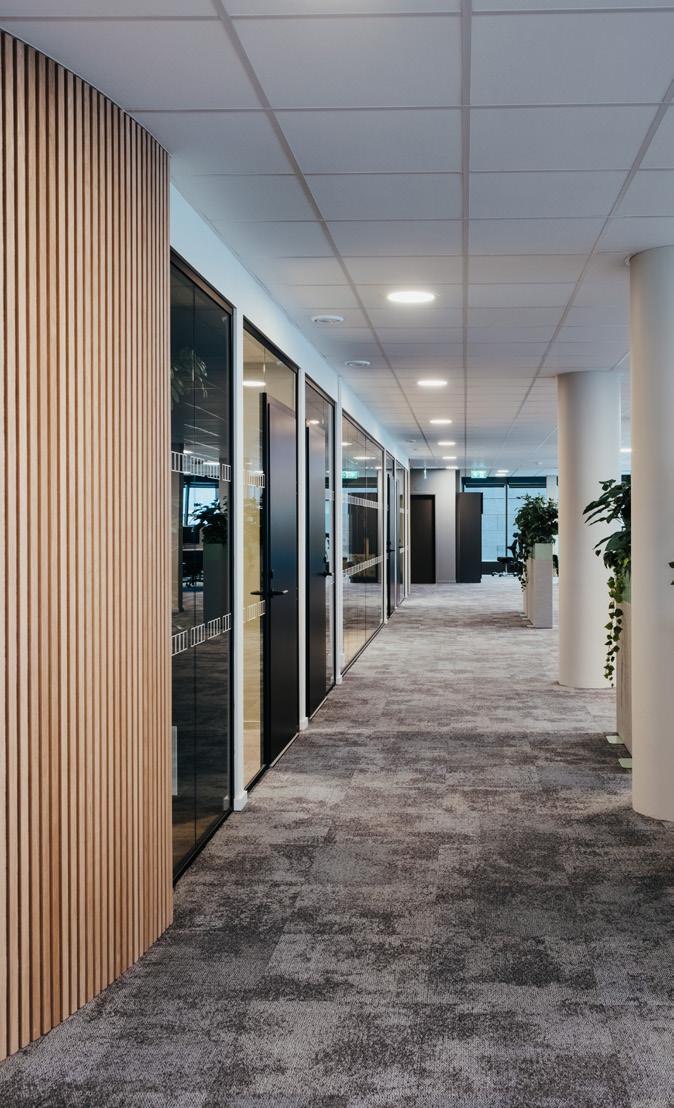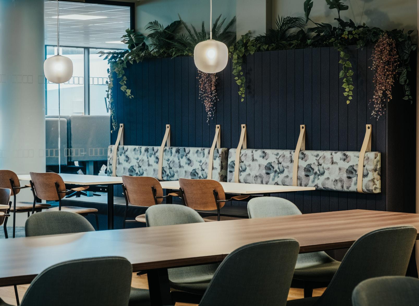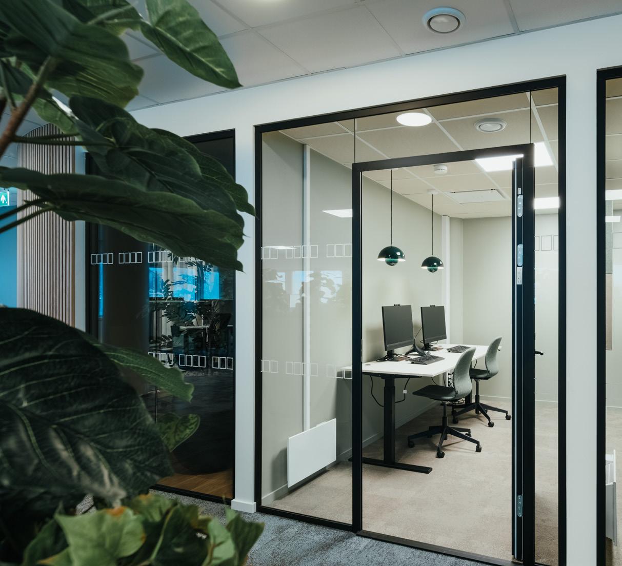 Vi kunne ikke vært mer fornøyd med resultatet! Med bruk av en varm fargepalett kombinert med spreke fargevalg og mønster, har vi fått helt unike lokaler som gir oss energi i en hektisk hverdag. Sosialsona som ligger i hjerte av bygget, har blitt en fantastisk møteplass for alle ansatte. Her kan vi finne hvilepulsen med en kaffekopp i en behagelig og lun atmosfære, samtidig som vi kan diskutere faglige problemstillinger på tvers. Møterommene har med sine mønster og farger blitt en arena hvor kreativiteten får blomstre i takt med teppegulvene.