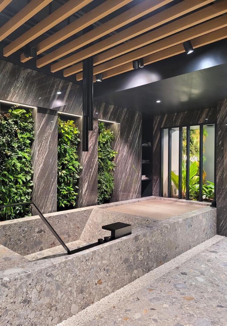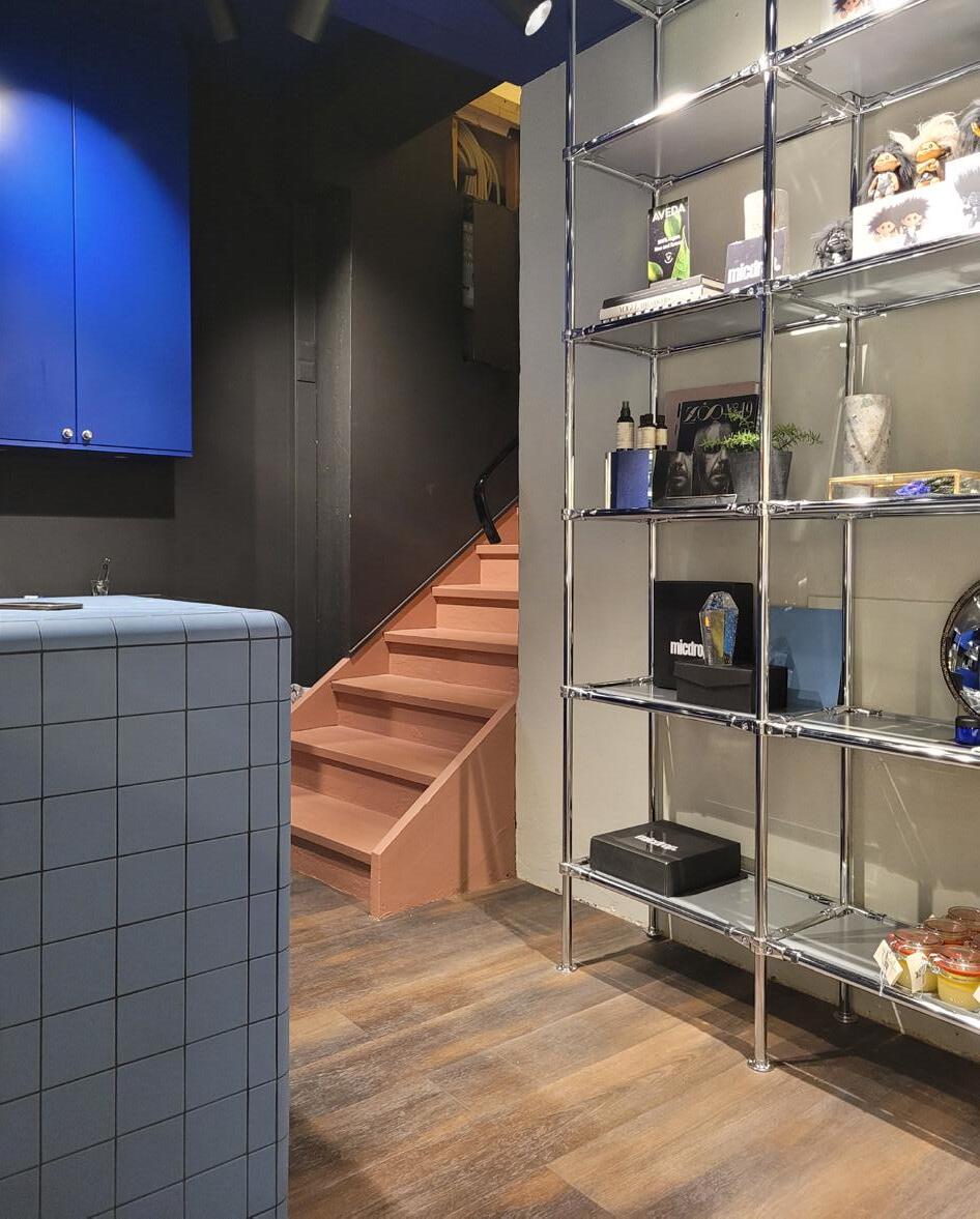 Målet var å skape den beste arbeidsplass, med atmosfære som skulle inspirere og engasjere. En plass med material mix og fokus på fagkunnskap. En salong med puls, og aktivitet, men samtidig være varm og personlig, en plass for pusterom i hverdagen. Det første som møter deg er en spennende, aktiv, sosial og frisk sone. Her er det ungt liv, en plass for å se og bli sett. Med en stor flislagt bar som knutepunkt, er dette den naturlige møteplassen. Denne sonen sitter du enten venter på din behandling eller bare innom for å kjøpe varer. Med et par klippe stasjoner, for de som liker å være der det skjer!