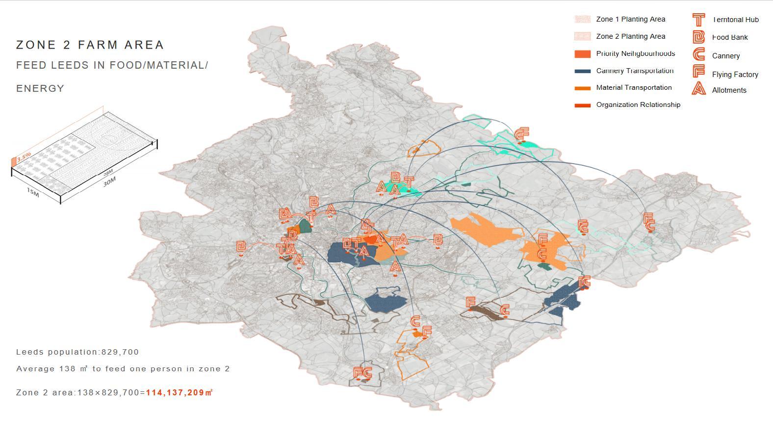 We caculated how much land we need in order to feed the citizens in leeds we divided different agricultural area in order to feed these people in priority neighbourhoods.