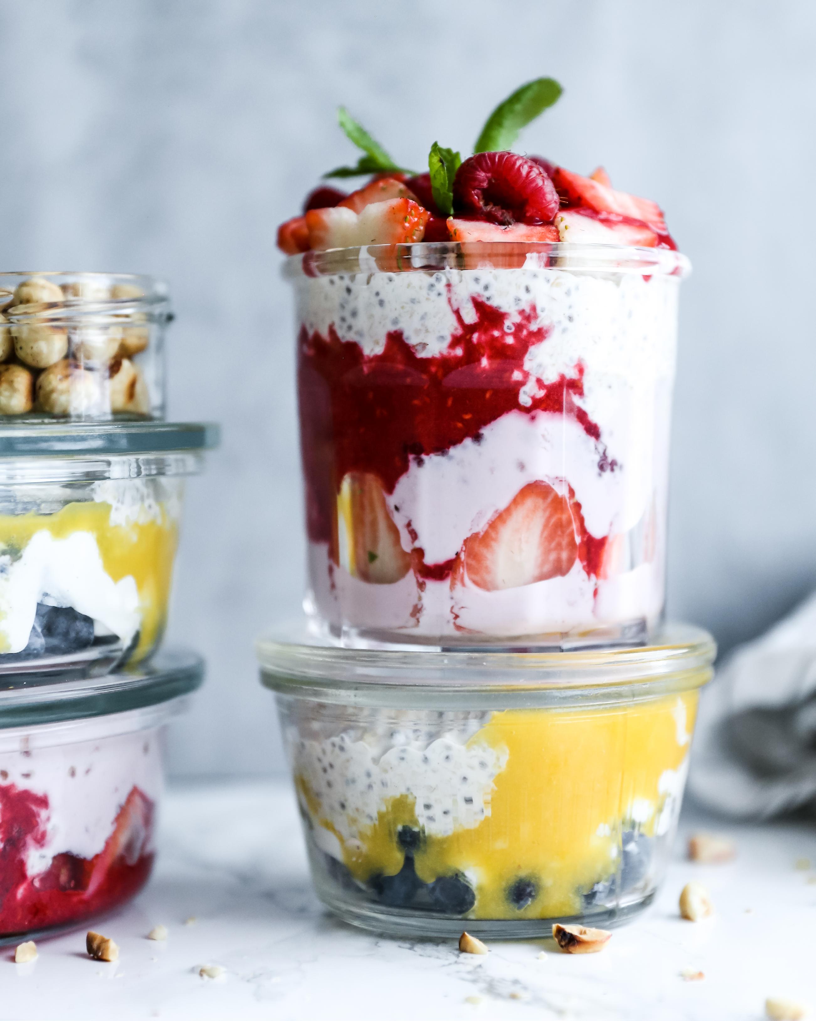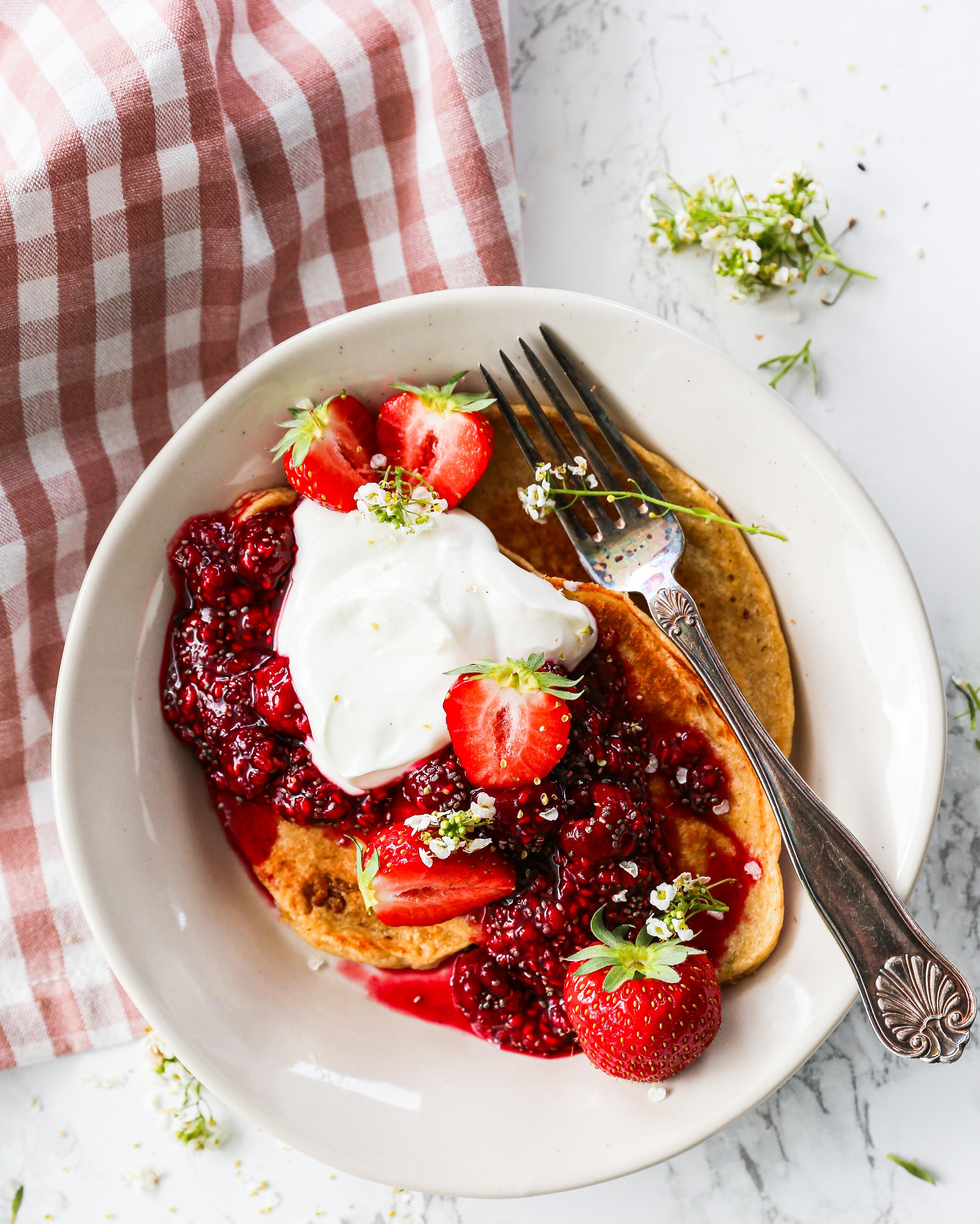 Karbohydrater: havregryn og frukt/bær Sunt fett: chiafrø