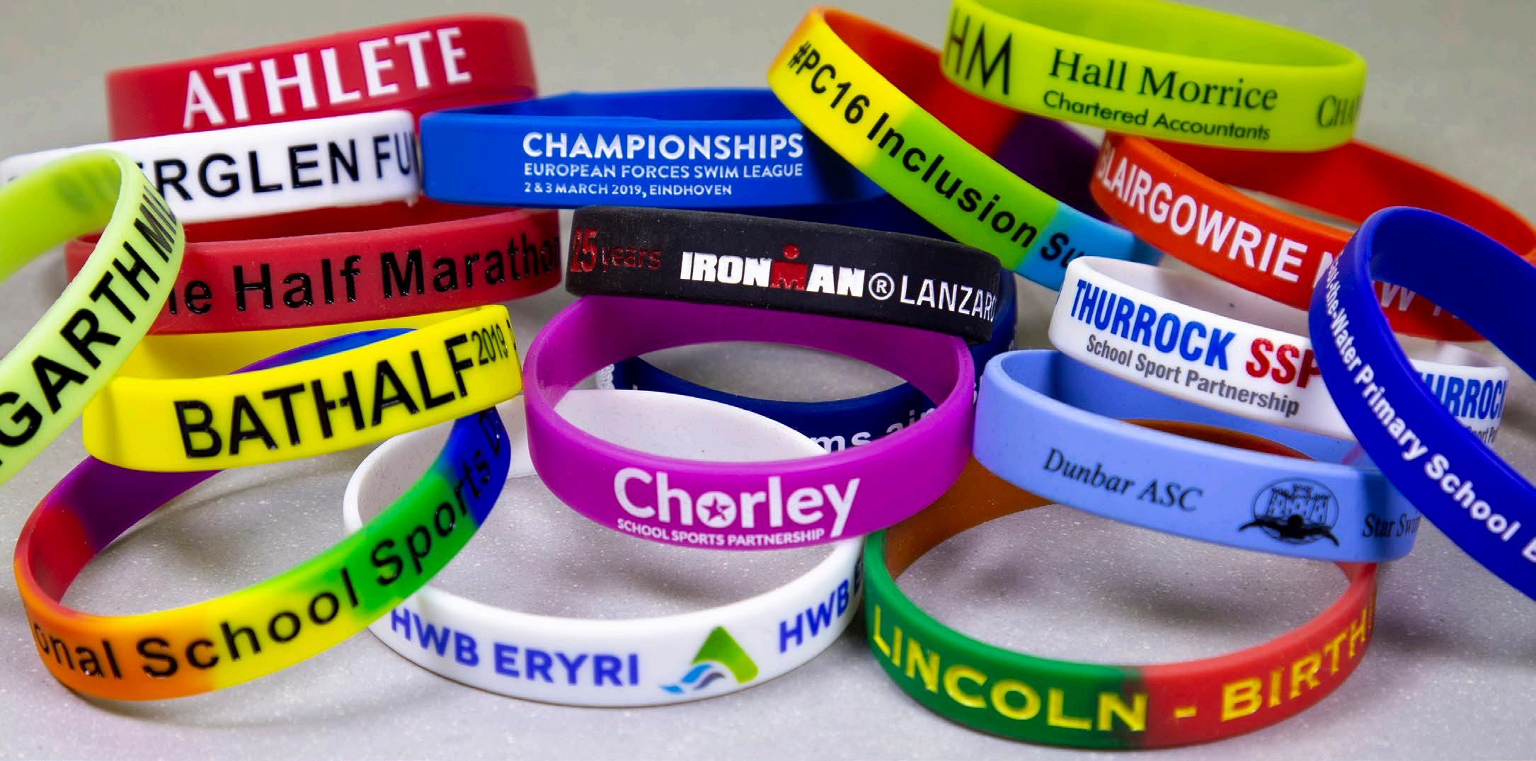 Qty 100+ 200+ 300+ 400+ 500+ 750+ 1,000+ 3,000+ Die charge Price per Wristband Plain 69p 65p 59p 55p 49p 47p 45p POA N/A Printed 74p 70p 64p 60p 55p 52p 50p POA £30 Debossed 69p 65p 59p 55p 49p 47p 45p POA £55 Debossed