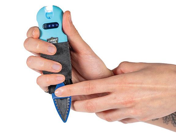 The Go Guarded Hand-Held with Stun Device is a stun device up top, with a Go Guarded blade below designed to provide runners with a selfdefense tool. The loud crackling voltage sound of the stun device can scare off threats. But if not, the stun device will deliver a shock that is enough to temporarily incapacitate an attacker. The Go Guarded blade at the bottom can be used for additional self-defense. MSRP: $35.99