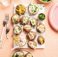 Uuniperunat onnistuvat helposti airfryerissa! Täytteitä on kaksi: tonnikala-kevätsipuli ja kinkku-suolakurkku.