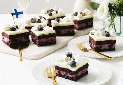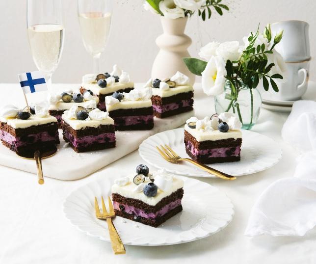 8. Nosta toinen leivoslevy leivinpaperilla suojatulle leikkuulaudalle. Levitä sille mustikkatäyte ja nosta päälle toinen leivoslevy. Levitä päälle valkosuklaatäyte. Siirrä jääkaappiin jähmettymään yön yli. 9. Leikkaa levy leivoksiksi terävällä veitsellä. Voit välillä kastella veistä lämpimässä vedessä, jotta saat siistin reunan. 10. Koristele leivokset murennetulla marengilla ja pensasmustikoilla.