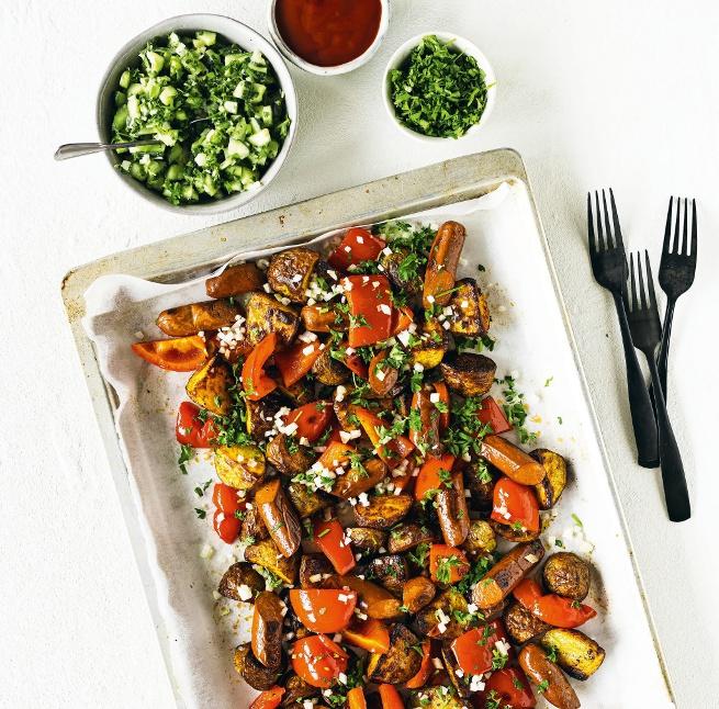 1. Skär gurkan i fyra delar på längden. Skrapa bort fröna med en sked och skär gurkan i små tärningar. Finhacka löken och ställ hälften åt sidan till servering. 2. Blanda olja, vinäger, senap, socker och salt till en slät dressing. Blanda dressingen och den finhackade persiljan med gurktärningarna och löken. Låt stå och dra i kylskåpet. 3. Tvätta potatisen noggrant och skär den i rejäla bitar. Bred ut potatisen på en ugnsplåt med bakplåtspapper eller i en stor ugnsform. Vänd i olja och kryddor. 4. Tillaga potatisen i 225 grader i cirka 20 minuter. 5. Skär bort fästet på paprikan och kärna ur den. Skär paprikan i rejäla bitar. Skär korvarna i fyra delar. 6. Ta plåten ur ugnen, tillsätt paprika och korvbitar. Tillaga i ytterligare 10–15 minuter. 7. Smaksätt ketchupen med sriracha. 8. Toppa plåten med lök och persilja och servera med gurksallad och chiliketchup.