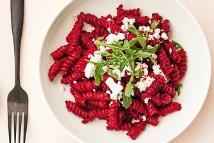Pirteä punajuuripasta valmistuu uunissa paahdetuista punajuurista, jotka soseutetaan kastikkeeksi. Fetamuru ja rucola viimeistelevät annoksen.