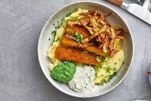 Valmista ihana hävikkiillallinen kalapuikoista ja perunoista. Tee perunoista muusia, perunankuorista sipsejä ja käytä koko kaprispurkki kastikkeeseen.