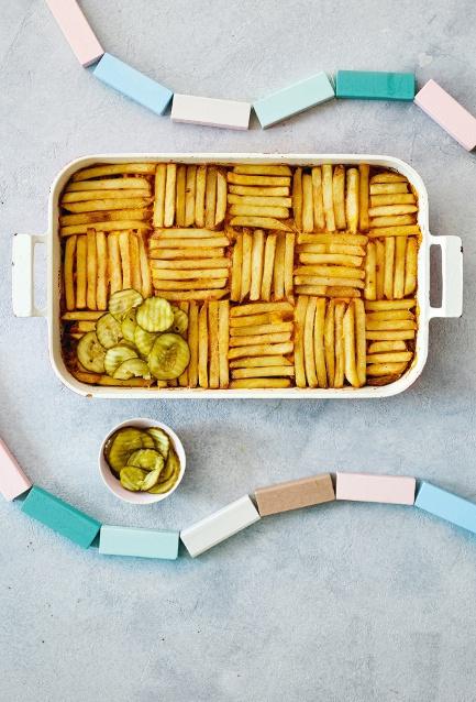 Ranskalaisvuoassa maistuvat hampurilaisaterian maut yhdellä puraisulla: jauheliha, tomaatti, juusto ja ranskalaiset. Toimii myös vegaanisella jauhiksella.