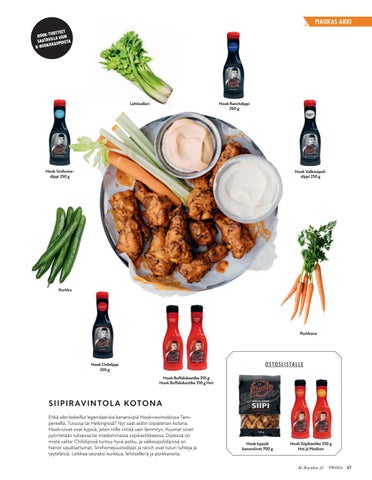 S I I P I R AV I N TOL A KOTONA Ehkä olet kokeillut legendaarisia kanansiipiä Hook-ravintoloissa Tampereella, Turussa tai Helsingissä? Nyt saat aidon siipiaterian kotona. Hook-siivet ovat kypsiä, joten niille riittää vain lämmitys. Kuumat siivet pyöritetään tulisessa tai miedommassa siipikastikkeessa. Dipeissä on mistä valita: Chilidipissä tuntuu hyvä potku, ja valkosipulidipissä on hienot sipulisattumat. Sinihomejuustodippi ja ranch ovat tutun tuhteja ja täyteläisiä. Leikkaa seuraksi kurkkua, lehtiselleriä ja porkkanoita.