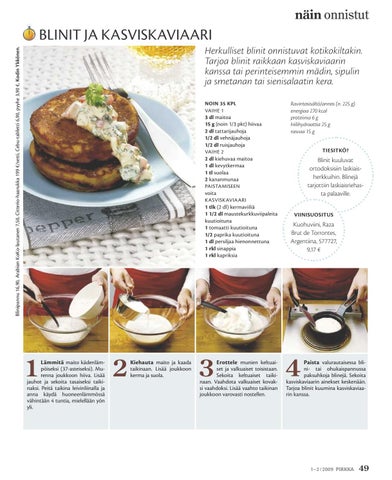 BLINIT JA KASVISKAVIAARI Herkulliset blinit onnistuvat kotikokiltakin. Tarjoa blinit raikkaan kasviskaviaarin kanssa tai perinteisemmin mädin, sipulin ja smetanan tai sienisalaatin kera. NOIN 35 KPL VAIHE 1
