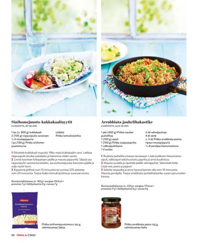 1 Ruskista jauheliha omassa rasvassaan. Lisää joukkoon hienonnettu sipuli, valkosipuli sekä kuutioitu paprika ja anna kuullottua. 2 Mausta suolalla ja ripottele päälle vehnäjauhot. Sekoittele hetki. Lisää vesi, pesto ja pippuri. 3 Sekoita tasaiseksi ja anna hautua kannen alla noin 10 minuuttia. Mausta persiljalla. Tarjoa arrabbiata-jauhelihakastike uusien perunoiden kanssa. Ravintosisältö/annos (n. 220 g): energiaa 175 kcal • proteiinia 17 g • hiilihydraattia 6 g • rasvaa 9 g