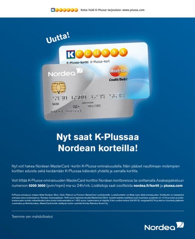 Nyt saat K-Plussaa Nordean korteilla! Nyt voit hakea Nordean MasterCard -kortin K-Plussa-ominaisuudella. Näin pääset nauttimaan molempien korttien eduista sekä keräämään K-Plussaa kätevästi yhdellä ja samalla kortilla. Voit liittää K-Plussa-ominaisuuden MasterCard-korttiisi Nordean konttoreissa tai soittamalla Asiakaspalveluun numeroon 0200 3000 (pvm/mpm) ma-su 24h/vrk. Lisätietoja saat osoitteista nordea.fi/kortit ja plussa.com K-Plussa-ominaisuus voidaan liittää Nordean Silver, Gold, Platinum ja Premium MasterCard -luottokorteille. Luottokortteihin voi liittää myös debit-ominaisuuden. Korttiluotto on toistaiseksi voimassa oleva luottosopimus. Nordean Avainasiakkaan 1500 euron käytössä olevalle MasterCard Silver -luotolle laskettu todellinen kulut huomioiva vuosikorko on 13 % ja luoton ja luottokustannusten arvioitu maksettavaksi tuleva luoton kokonaismäärä on 1 602 euroa. Laskennassa on käytetty 3 kk:n euribor-korkoa (04/2013), marginaali 8,5 % ja siinä on huomioitu pääkortin vuosimaksu ja tilinhoitomaksu. MasterCard-korttiin sisältyvän luoton myöntää Nordea Rahoitus Suomi Oy.
