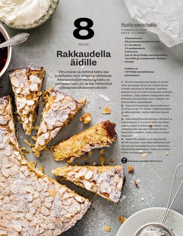 Ricotta-mantelikakku 1 6 A NNOSTA | YLI 60 M IN HINTA N. 70 € / A NNO S* 4 kananmunaa 125 g huoneenlämpöistä voita 2 ½ dl sokeria 1 tl vaniljasokeria 3 sitruunaa 2 ps (à 100 g) Pirkka mantelijauhetta 1 prk (250 g) ricottajuustoa (Galbani Finette) PINNALLE