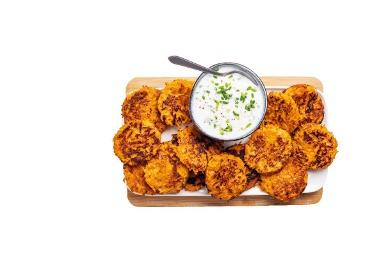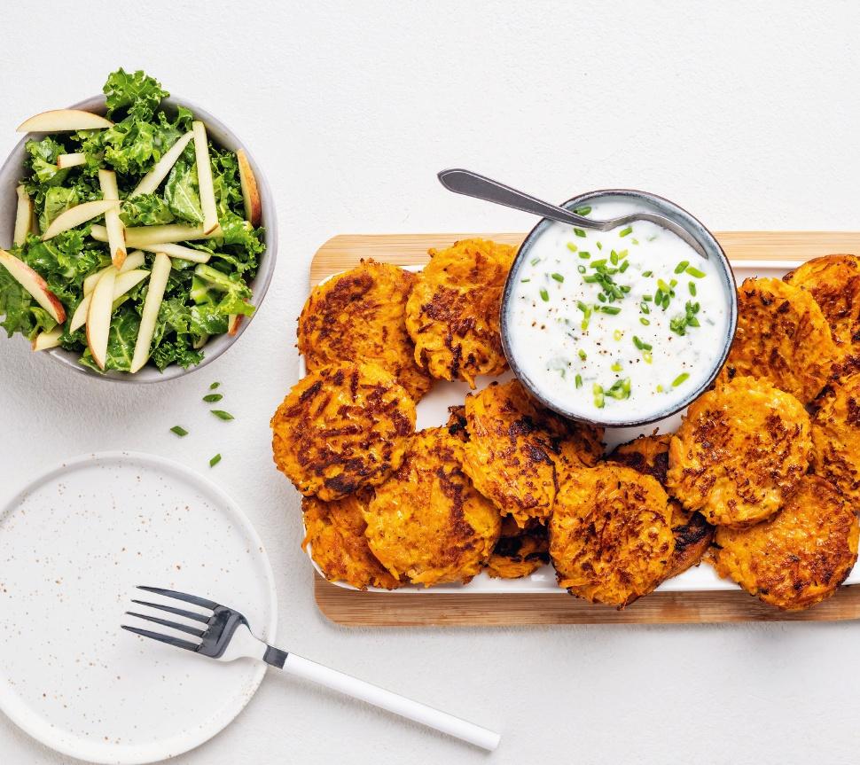 Kauniin oranssit pihvit ovat hauska tapa syödä paljon kasviksia kerralla. Kaverina maistuu raikas raejuustokastike.